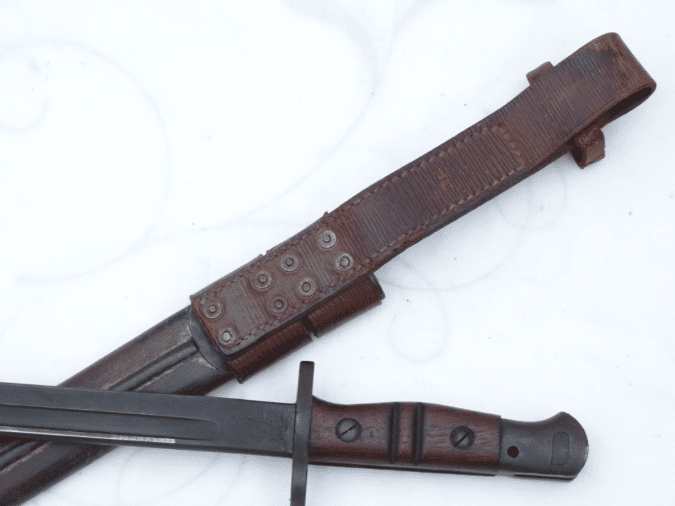 This is a Remington made Model 1917 bayonet as fitted to the US Model 1917 rifle (often mistakenly called the P17) and also the Enfield P14. These bayonets were re-issued in WW2 to be used with the P14 and M17 rifles that armed the Home Guard units. This particular bayonet is in very good condition, with excellent straight blade with dark parkarised finish to the entire length, undamaged edge and point, factory sharpened only. Marked 1917 for the pattern above the maker logo for Remington, the other side showing the 'flaming bomb' and eagle's head motifs and US. Very good grips and original blacked finish to crossguard and pommel. The scabbard is equally good with original greeny finish to the leather, and maker marked throat and chape, still showing green cammo paint, and nice and tight. The scabbard that has been converted for use with leather Home-Guard frog, so must have been issued to a HG unit during WW2. Frog is in good sound condition, perfect stitching, and sound loop. A great addition to any WW1 P14 or M17, or Home Guard enthusiast.