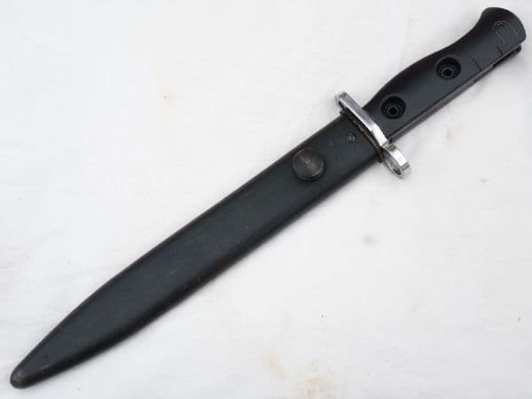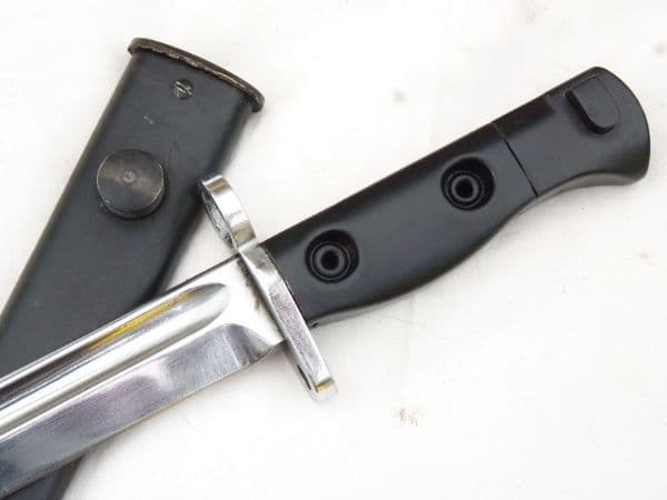 This is a SLR L1A2 bayonet and scabbard.  No markings, with all steel rivetted grips, this variant was manufactured in Lithgow, Australia and is in perfect condition. Nearly identical to the British made L1A1 variant, with the characteristic protruding release button, but slightly different blade shape and fuller design, these SLR bayonets were also made in Canada and India. This particular example has had the blade chromed for presumably parade use, and it is in excellent condition. Very good undented complete scabbard.