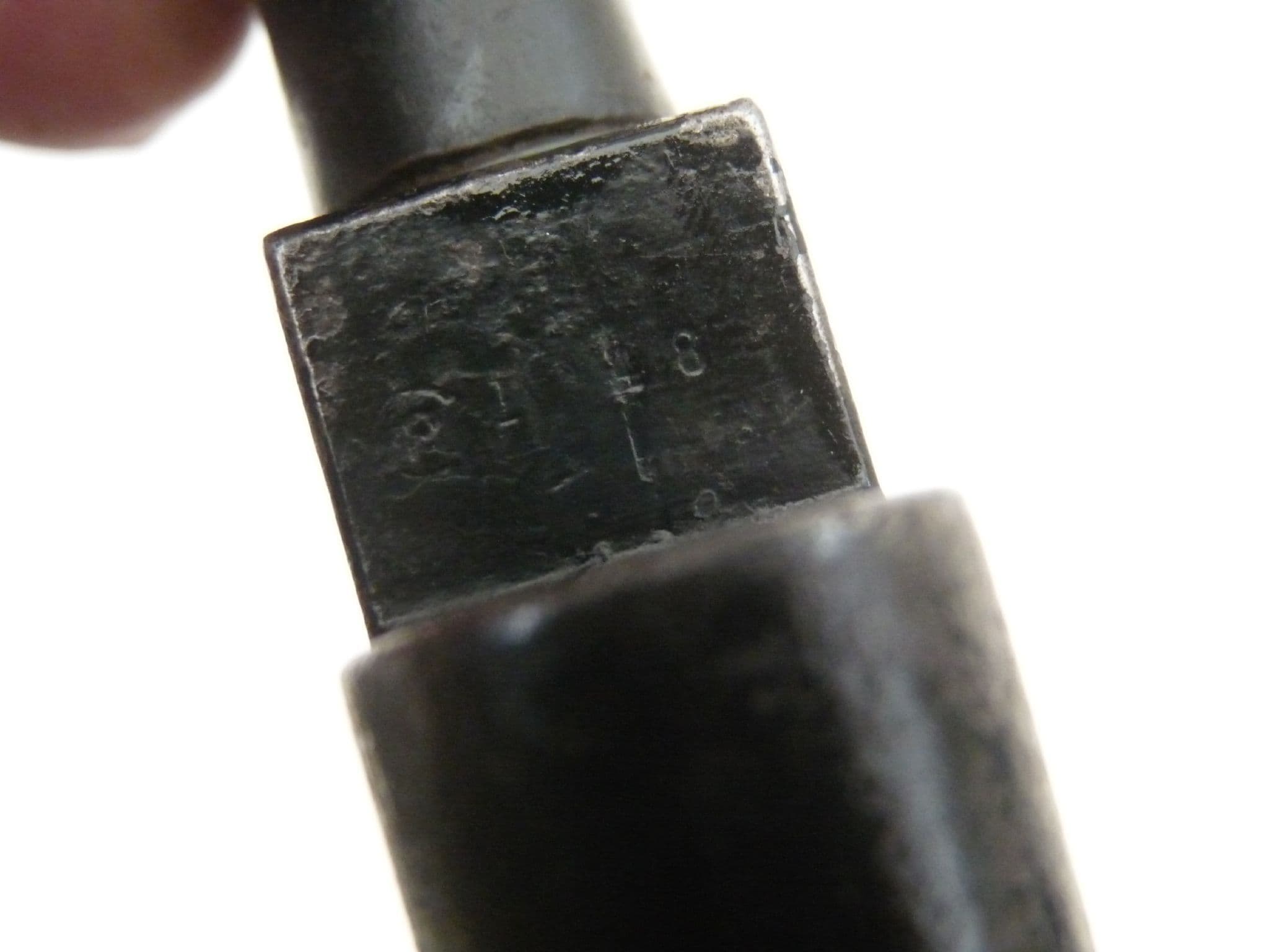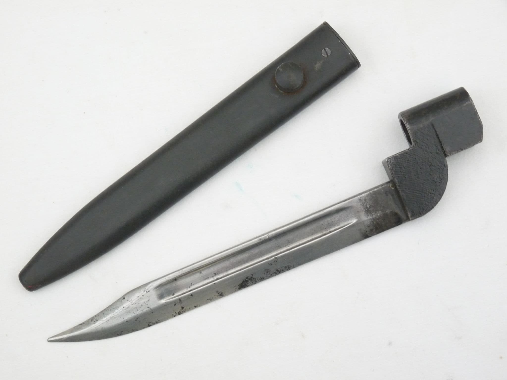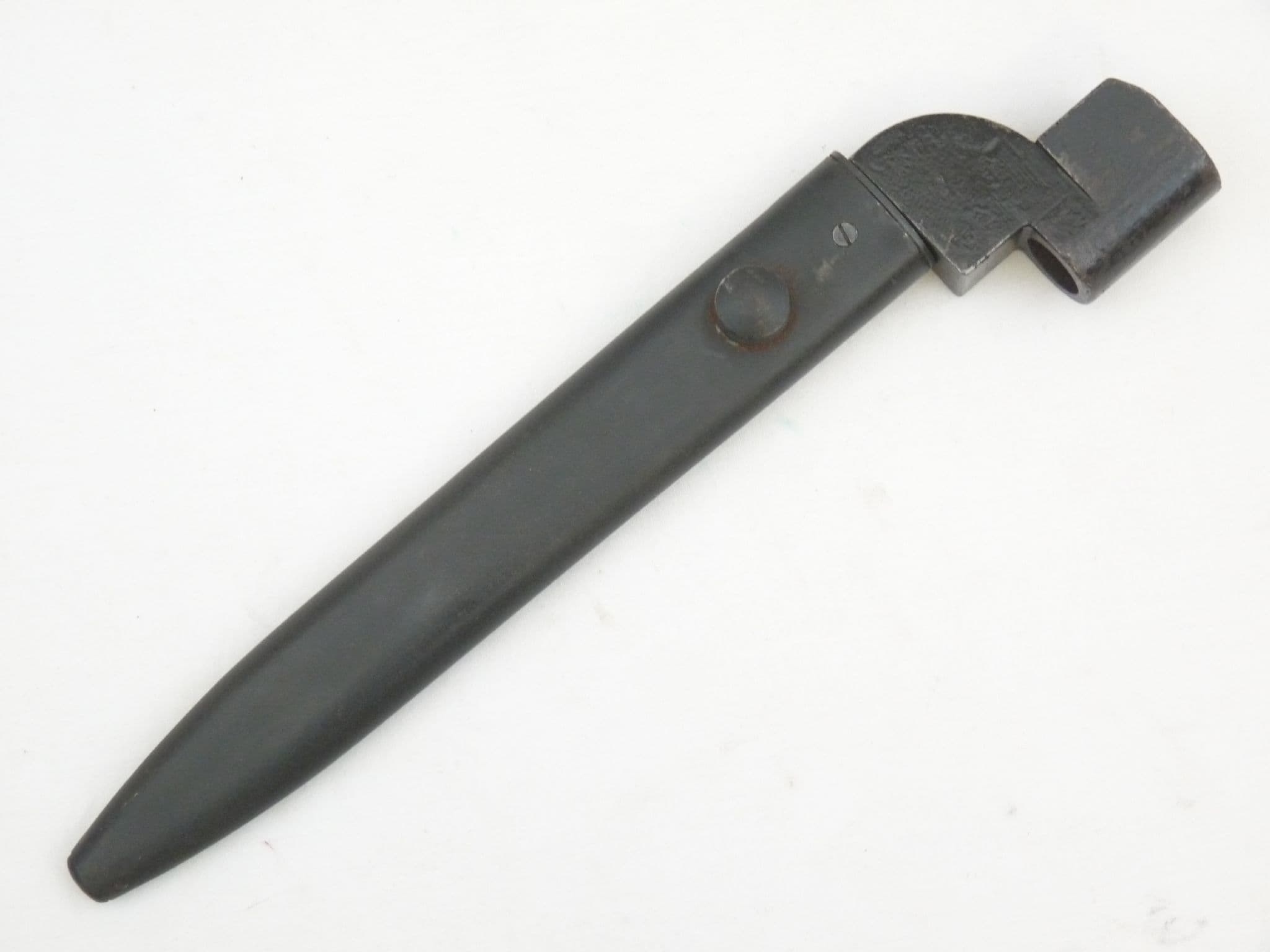 This is the No.9, last of the line for the socket bayonet fitted to the Lee-Enfield no.4 rifle. The simple No.4 spike transformed into the elaborate no.7 knife bayonet with rotating handle, and then finished as a cross between the two, a knife bayonet without handle which served only one purpose.  In good condition with very good point and factory edge, though showing some signs of corrosion on the blade. Poole factory stamped on the socket with a date of 1948. Very good undented scabbard, though again showing signs of corrosion that would have been under the frog. A great addition for a post-war Enfield no4 rifle, but will of course fit any No4 rifle. Genuine webbing frogs also available for £10, no extra post if ordered together.
