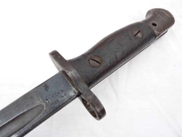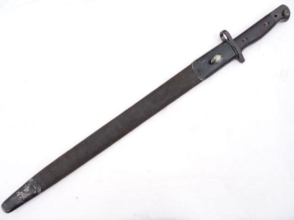 This is a Pattern 1907 bayonet for use with the Lee-Enfield rifle no1 mk3 or mk3*, better known as the SMLE in good condition.  The stamped details on the ricasso show a date of  5 '18 under the Royal Cypher of George V, 1907 for the Pattern, and  Wilkinson, as the manufacturer.  The other side shows inspection stamps, bend test and broad arrow marks, and re-acceptance in 1924. The blade is in very good condition, with typical parkerised finish to the steel and a blacked ricasso, very good edge and point, with no signs of sharpening.  Both wooden grips are complete and sound and good release button. Nicely blued pommel and crossguard with only minor signs of corrosion. The oval frog-stud scabbard is undamaged and unbent, all stitching intact to the leather, with most of the original finish on the steel and remnants of original black paint.  A lovely piece of history to compliment any WW1 SMLE.