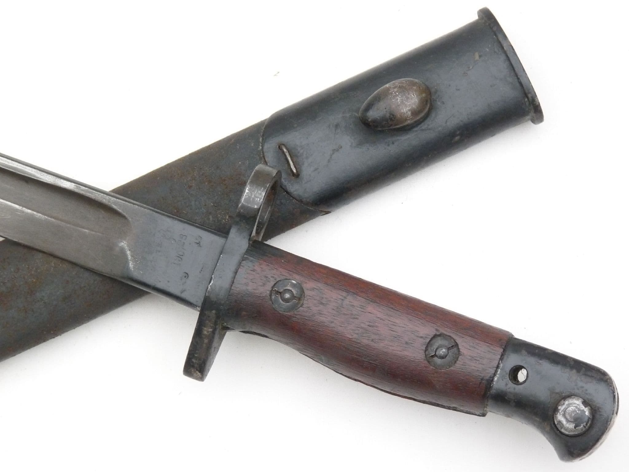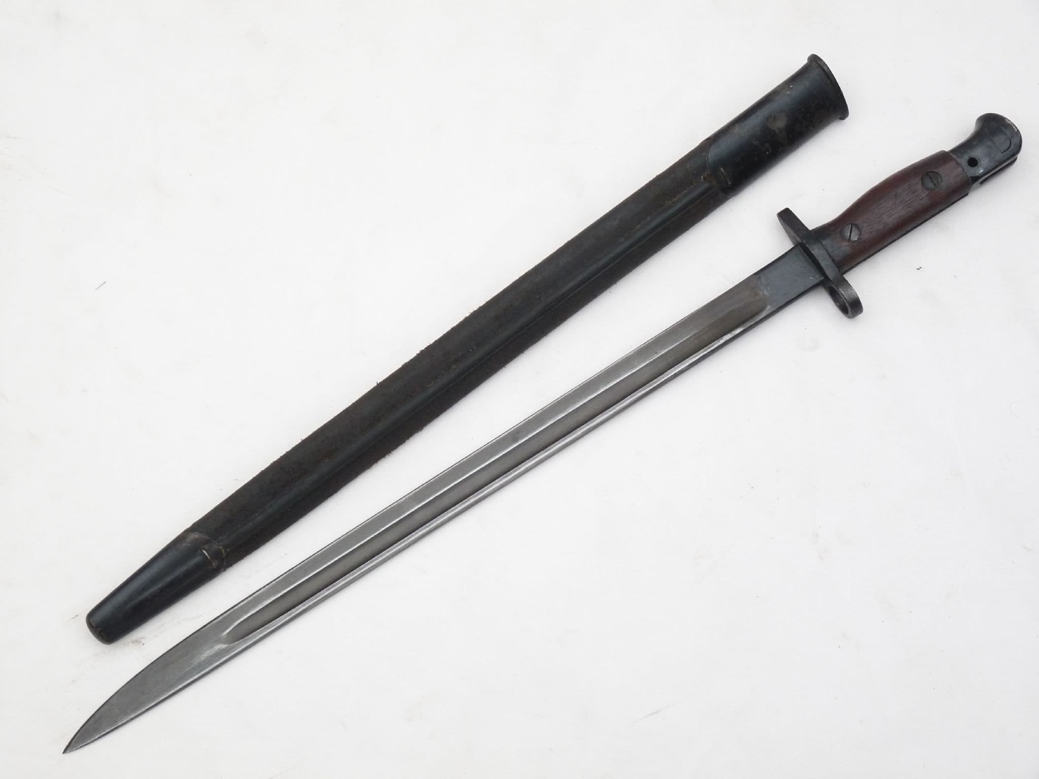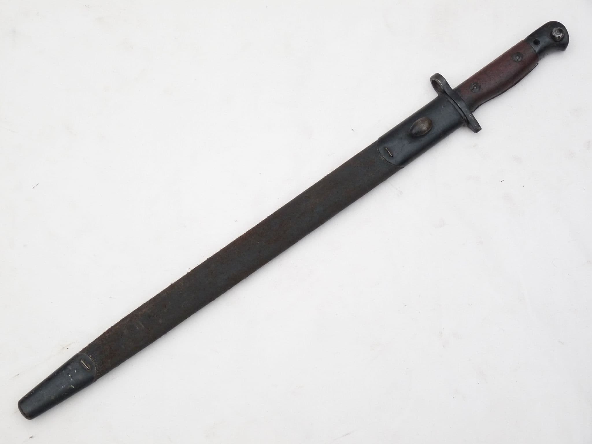 This is a Pattern 1907 bayonet for use with the Lee-Enfield rifle no1 mk3 or 3*, better known as the SMLE.  Ricasso markings show 1907 for the Pattern under a faint Royal Cypher of George V,  9 '17 for manufacture date and Sandersons as the manufacturer. The other side shows acceptance marks, broad arrow and bend test. The parkarised steel blade is in very good condition, good point and  excellent unsharpened edge. Both wooden grips are complete and in very good condition, good release button, and good blacking to crossguard and pommel under original black paint. The oval-frogstud scabbard is also in good sound condition, all stitching intact, similar black finish to the nice and tight throat and chape. A lovely untouched piece of history to compliment any WW1 SMLE.
