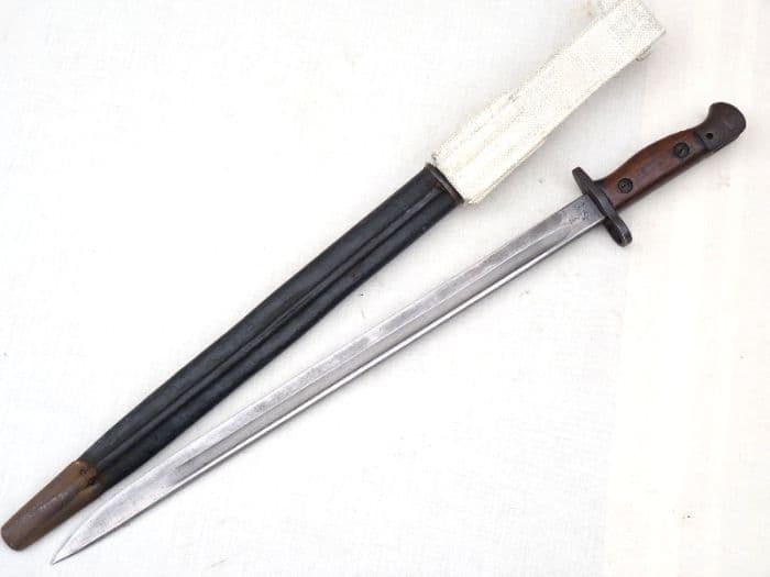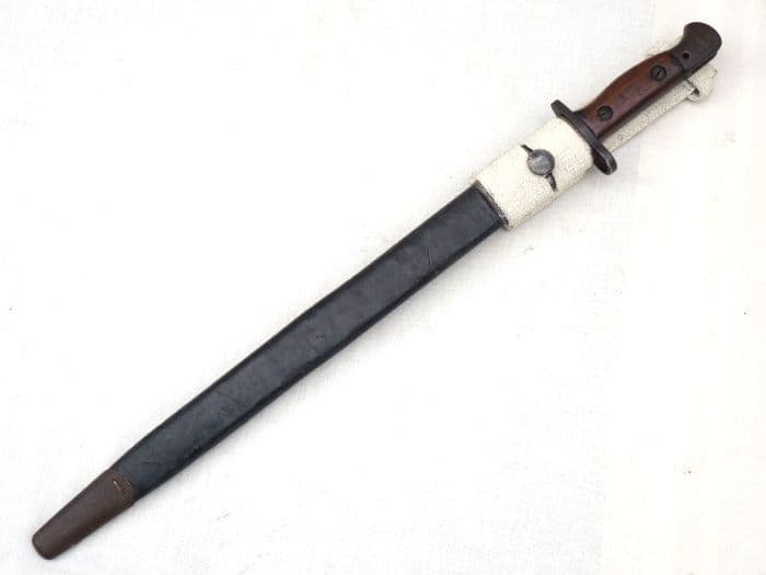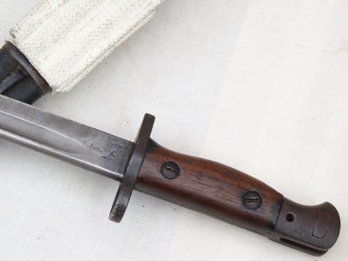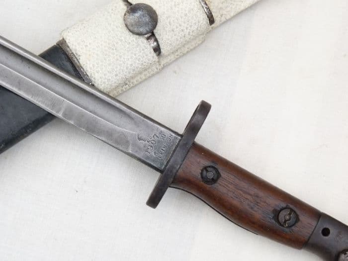 This is a Pattern 1907 bayonet for use with the Lee-Enfield rifle no1 mk3 or 3*,  better known as the SMLE.  Ricasso markings show 1907 for the Pattern under the Royal Cypher of George V, 6 '18 for manufacture date and Wilkinson as the manufacturer. The other side shows acceptance marks, broad arrow and bend test, and no re-acceptance. The parkerised steel blade is in very good condition, perfect point and lightly sharpened edge, with faintly blacked ricasso. Both wooden grips are in sound condition, with very faint inspection stamps on both, good release button, and dark patina to pommel and crossguard showing some light corrosion. The round-fogstud scabbard is also in good sound condition, all stitching intact, matching finish to the throat and chape. Fitted into correct 1937 pattern blancoed frog. A lovely piece of history to compliment any WW1 or WW2 SMLE rifle.