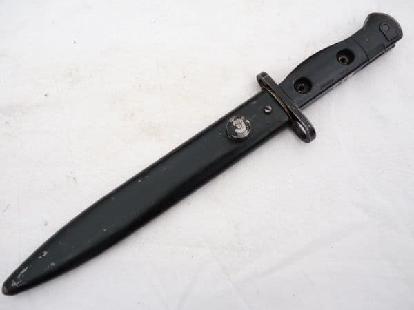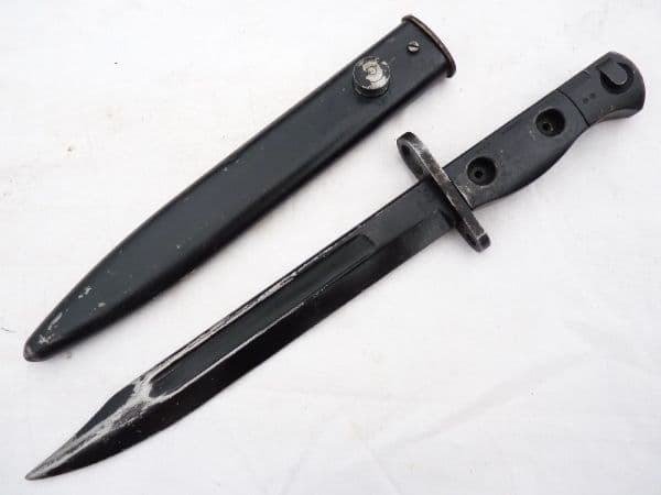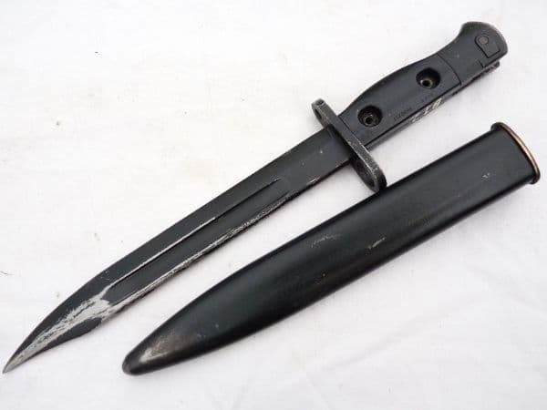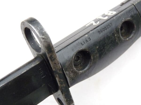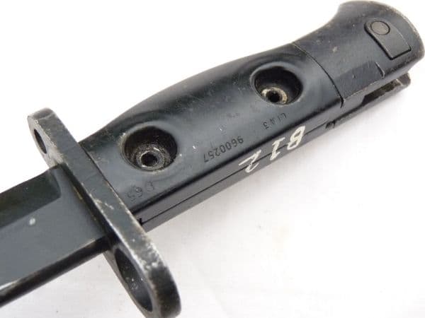 This is a SLR L1A3 bayonet and scabbard in good used condition, as fitted to the British issued SLR rifles.  Marked with the superimposed ED Enfield symbol followed by 66 on the ricasso, it has all steel rivetted grips, marked L1A3 9600257  on the left and right side, and ED 65. The characters B12 are painted on the top of the grips. Excellent edge and point to the partially worn black coated blade, good release button, and good complete and undented scabbard with an Enfield mark on frog-stud.  Frogs also available for £5 post free with bayonet.