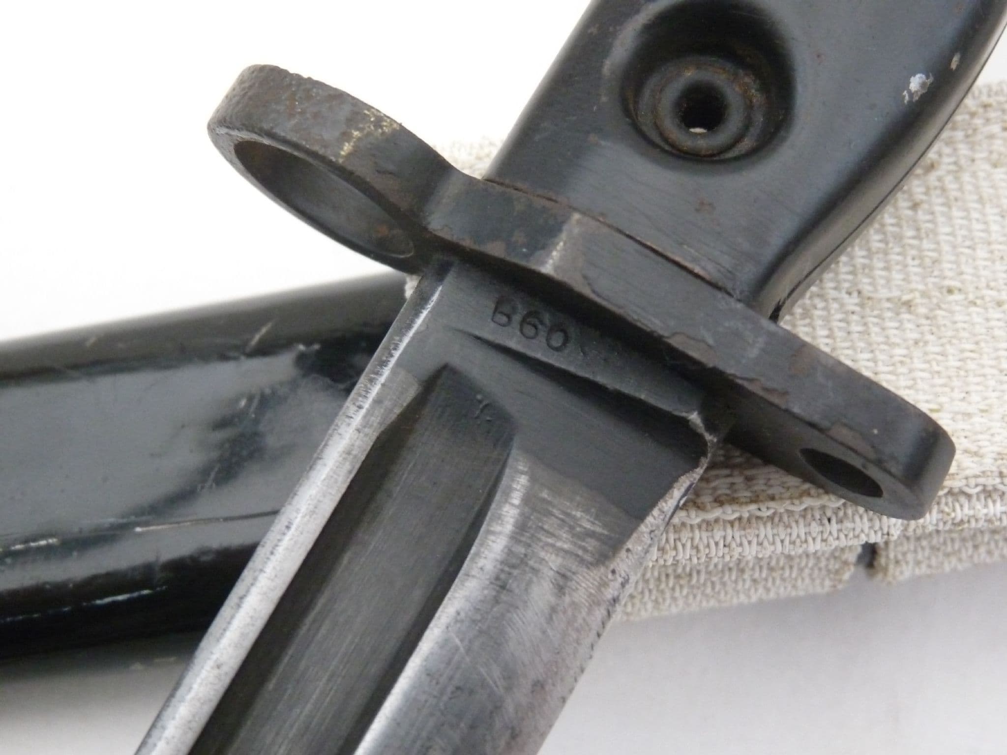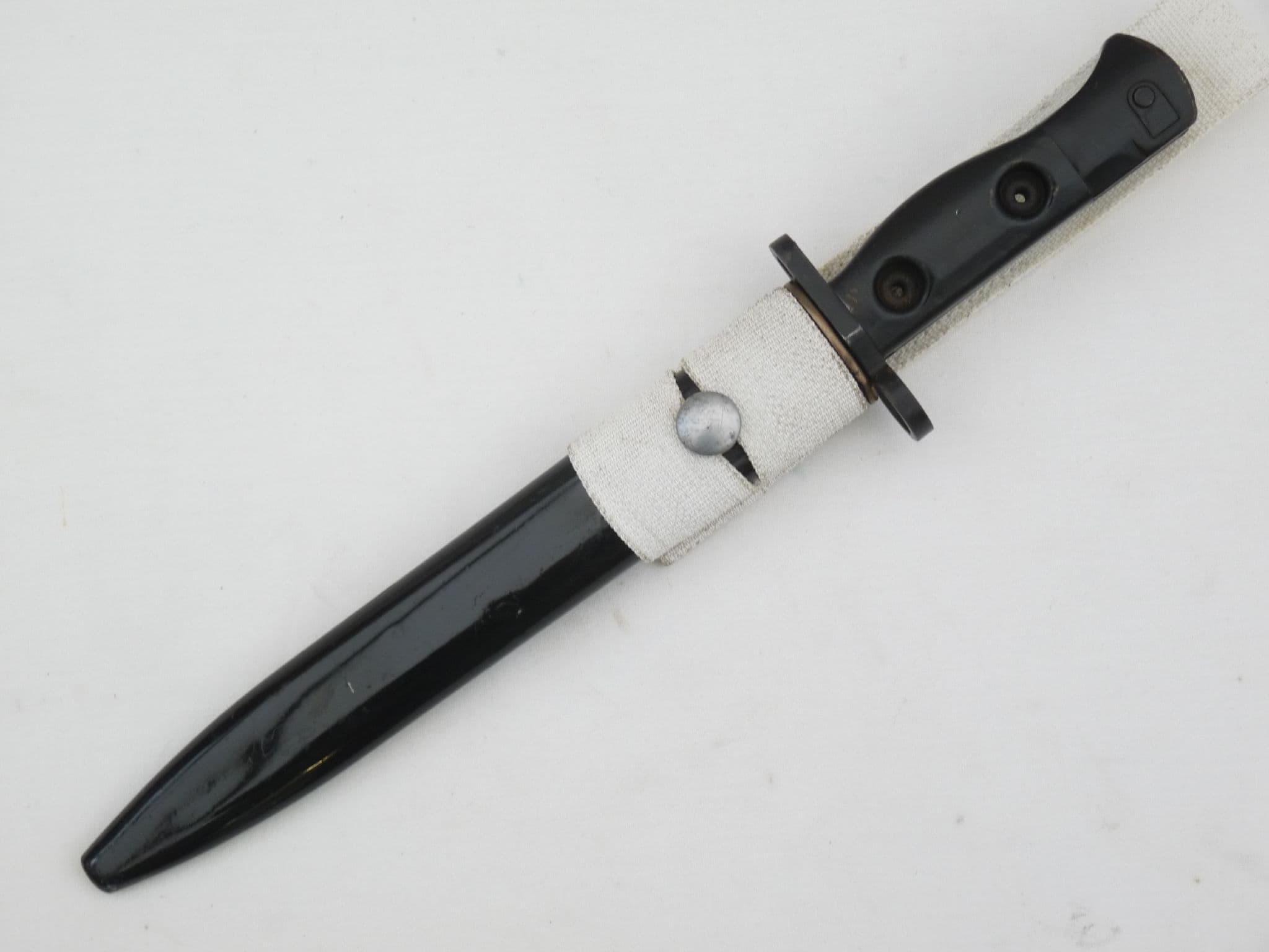 This is an early SLR L1A3 bayonet and scabbard in good condition with transitional waisted crossguard, as fitted to the British issued SLR rifles.  This example has been painted in thick gloss paint, with a polished frog-stud, and fitted into a white nylon frog for parade use. Good steel rivetted grips, and the polished blade showing signs of minor sharpening, but not overdone, reflecting perhaps it's life in the army. Stamped B60 for the year on the ricasso.  Good scabbard with correct brass throat, a nice example of this increasingly sought-after and appreciating bayonet.