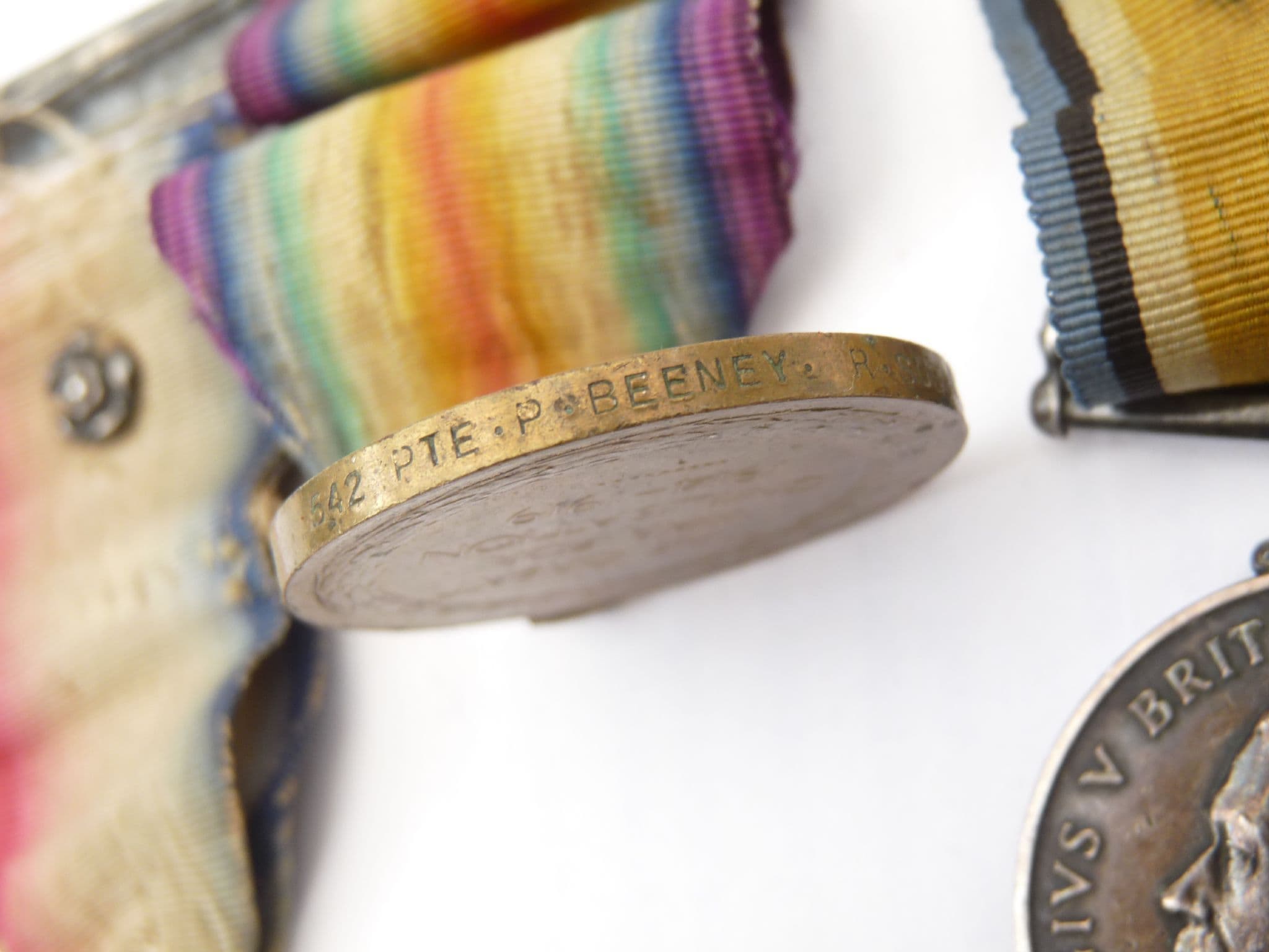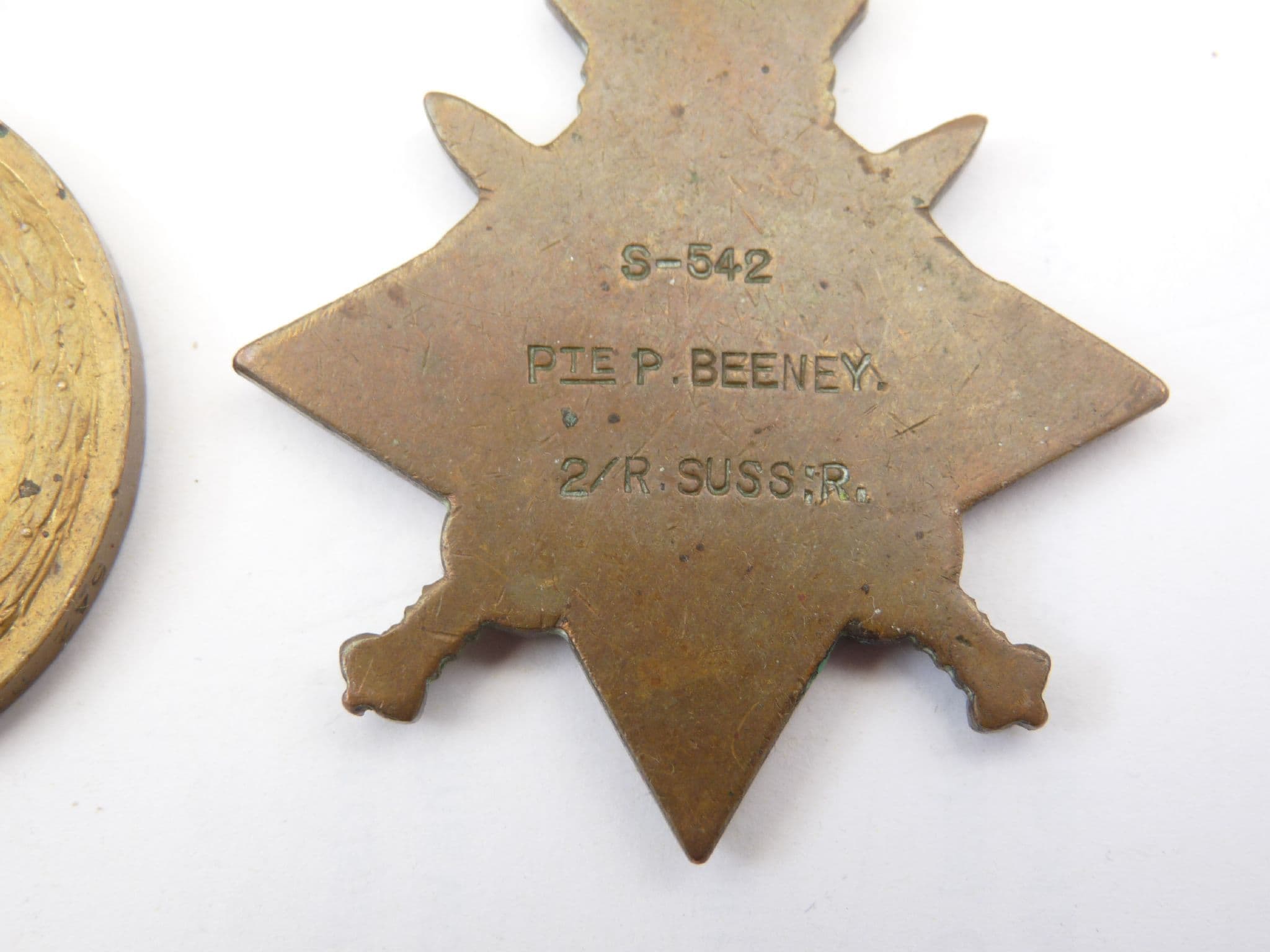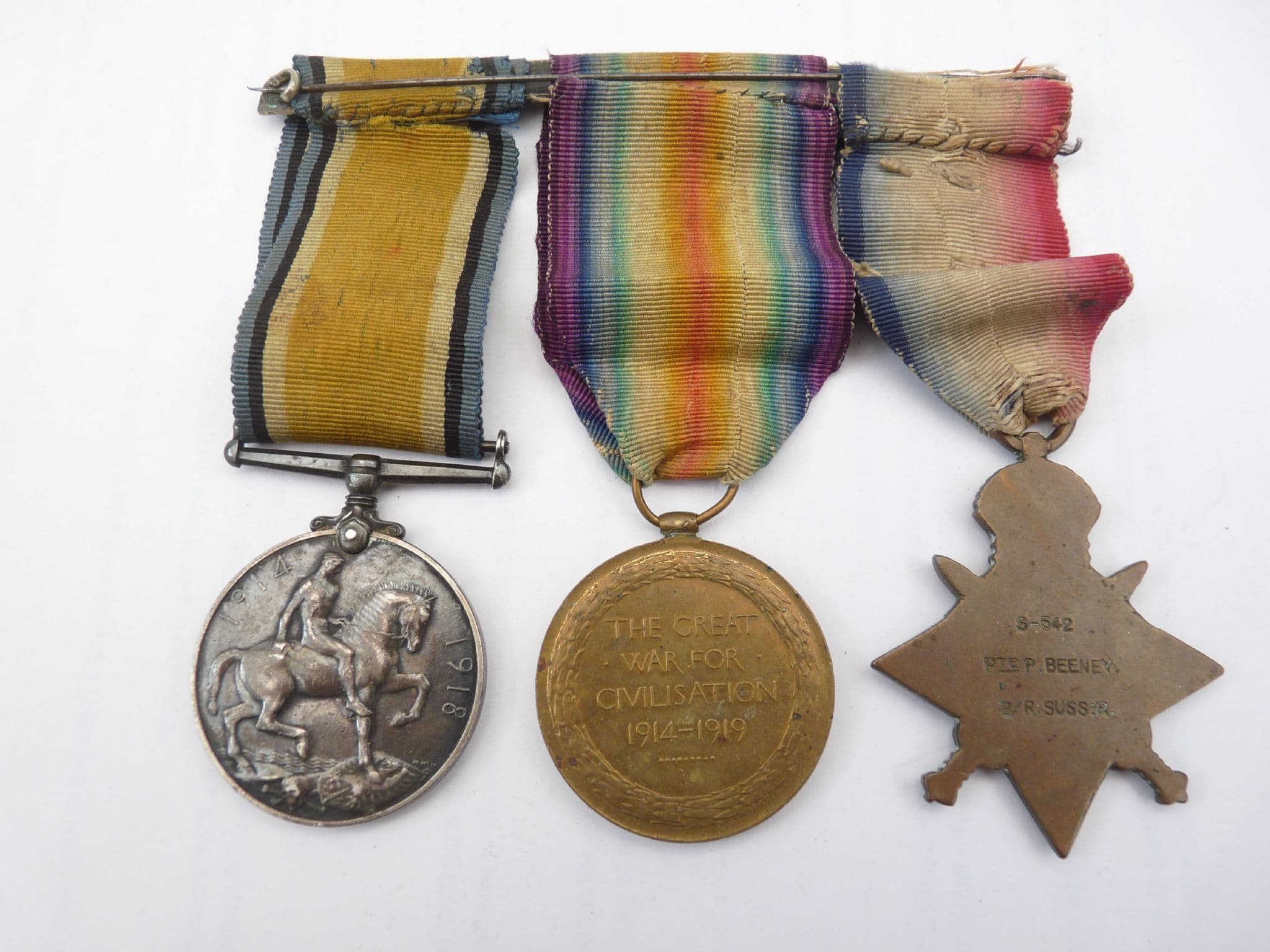 This is a genuine WW1 Mons Trio awarded to Private P. Beeney, of the 2nd battalion Royal Sussex Regiment. Stamped S-542, PTE. P. BEENEY, 2/R.SUSS.R. on the back of the 1914 Star, and 542, PTE. P. BEENEY R.SUSS.R. on the edge of the British War Medal and Victory Medal. The medals are in generally good condition with no damage worth mentioning and just a patina of age. The ribbons are rather poor but original to the medals as worn. The 1914 Star ribbon has an attached rosette, and evidence of the Mons bar, now lost.