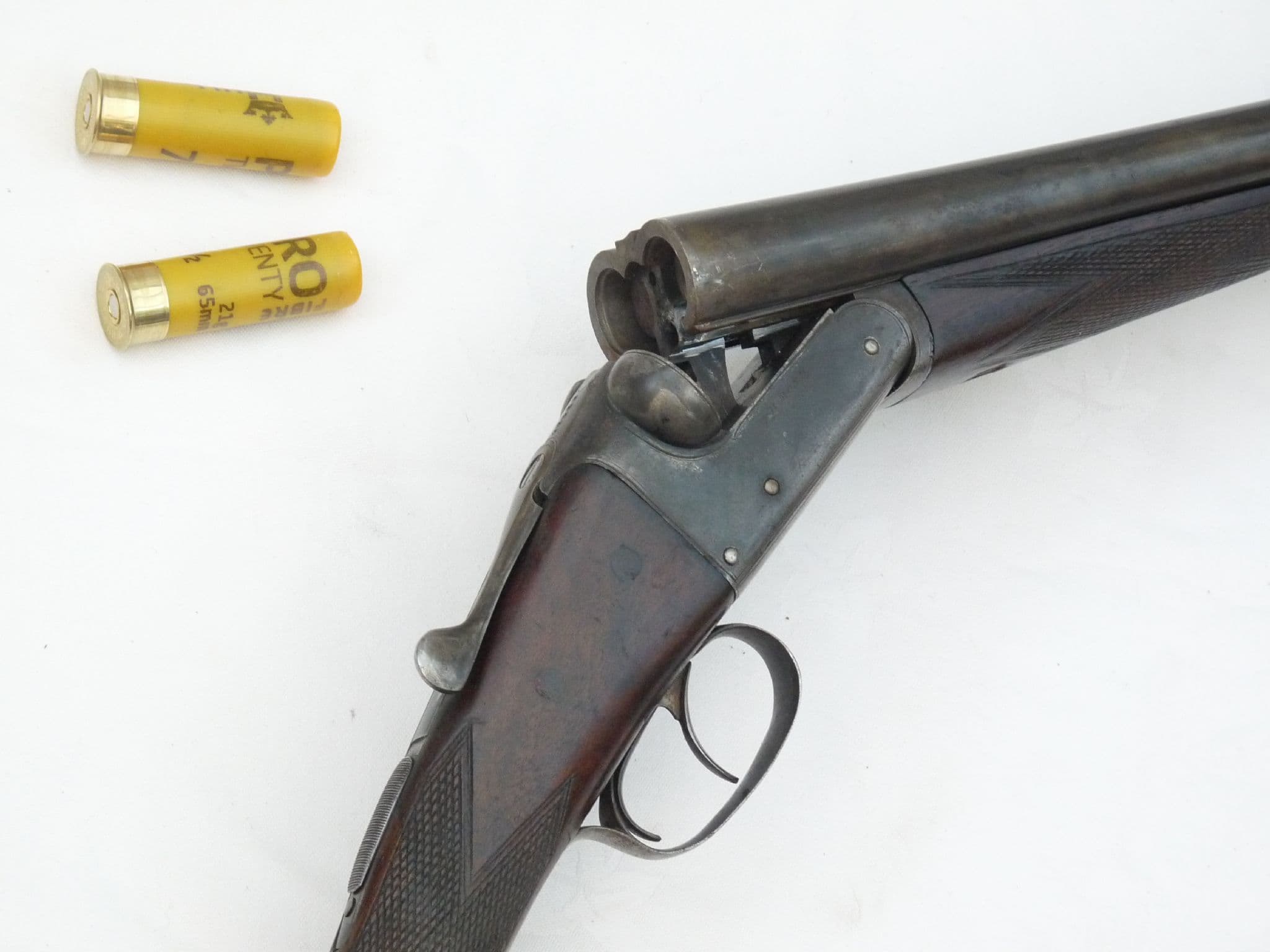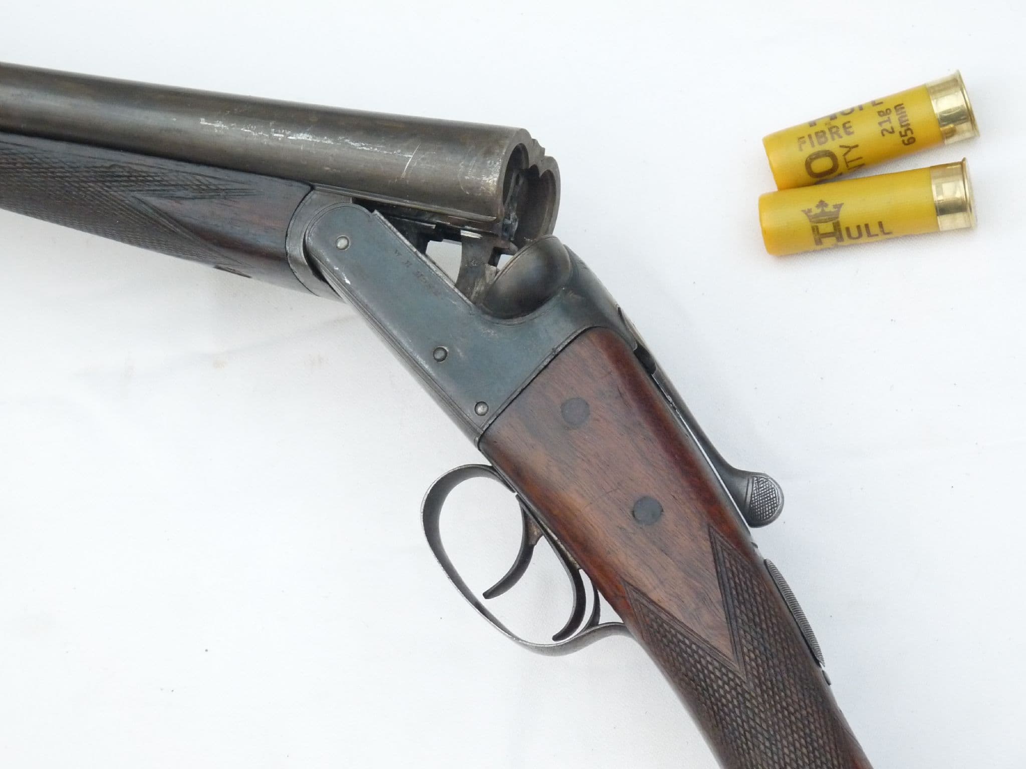 This is a beautiful old boxlock action sporting shotgun of side-by-side construction, made by W.H.Monk of Chester as engraved between the 28" barrels and on the action sides, who traded from 1868 up to 1925. Classic cross-hatched hardwood furniture with beautiful grain in super condition. All the blacking remaining on the plain action and barrels. This shotgun breaks and has moving triggers and safety lever, but under current EU rules will not dry-fire or strip. Two inert 20 bore cartridges are included, with more available separately in the 'Inert Ammunition' section at £1.50 each. Deactivated in the UK with Certificate to UK/EU specification.
