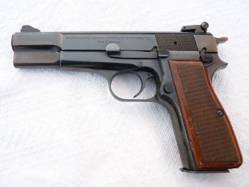 This is a deactivated Browning Hi-Power automatic pistol made by FN Fabrique Nationale of Belgium.  This weapon is in very good condition, with near faultless finish to the steel, showing just the normal light wear of a used side-arm, and with good wooden grips showing just minor marks. The serial number dates this pistol to 1976, being of the format 76CXXXXX, and it features an ambidextrous safety catch for a left-handed shooter. Fitted with commercially available enhanced fore and rear-sights, this weapon cocks and dry fires with a very precise action, and has a detachable 12-round magazine, and comes with 3 inert 9mm rounds.   Deactivated in the UK with Certificate to UK specification.