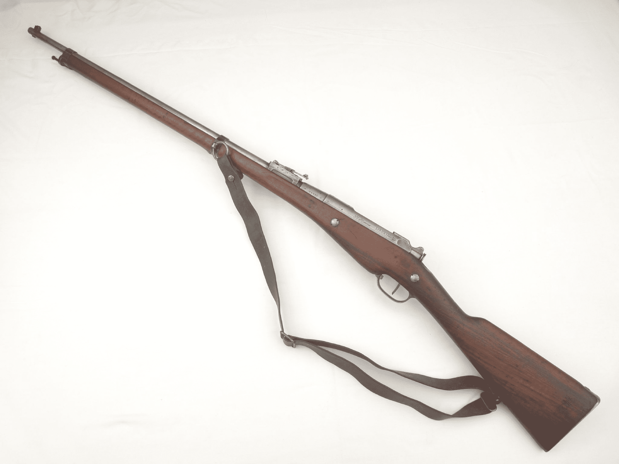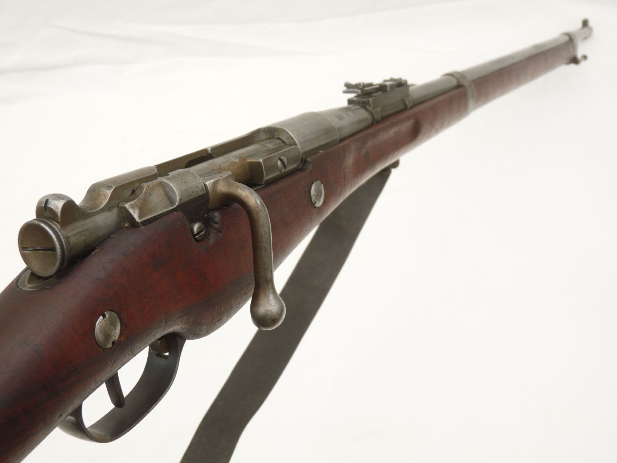 This is the french Berthier fusil Mle 1907/15 infantry rifle, initially designed by engineer Emile Berthier in the late 1880's. Lighter and easier to handle than the Lebel Mle 1886/93, its main drawback was it's minimal 3-round magazine capacity. The Mle 1907 was modified in 1915 to become the Mle 1907/15, but was issued only in small numbers to frontline troops to help with the lack of Lebel rifles, mainly because of its limited magazine capacity. The majority went to colonial troops and the Foreign Legion. The Mle 1907/15 was used up till the 1940s, though by then the magazine capacity had been increased to 5! This particular example is in very good original condition, manufactured at the St. Etienne Armoury (MAS), dated 1915 on the barrel, and with matching serial numbers to breech, bolt, trigger guard and stock, and able to be cocked, dry-fired and field stripped. Centre bayonet lug on barrel missing but does not effect bayonet fitting. Comes complete with original leather sling. Deactivated in the UK with proofhouse certificate of deactivation.