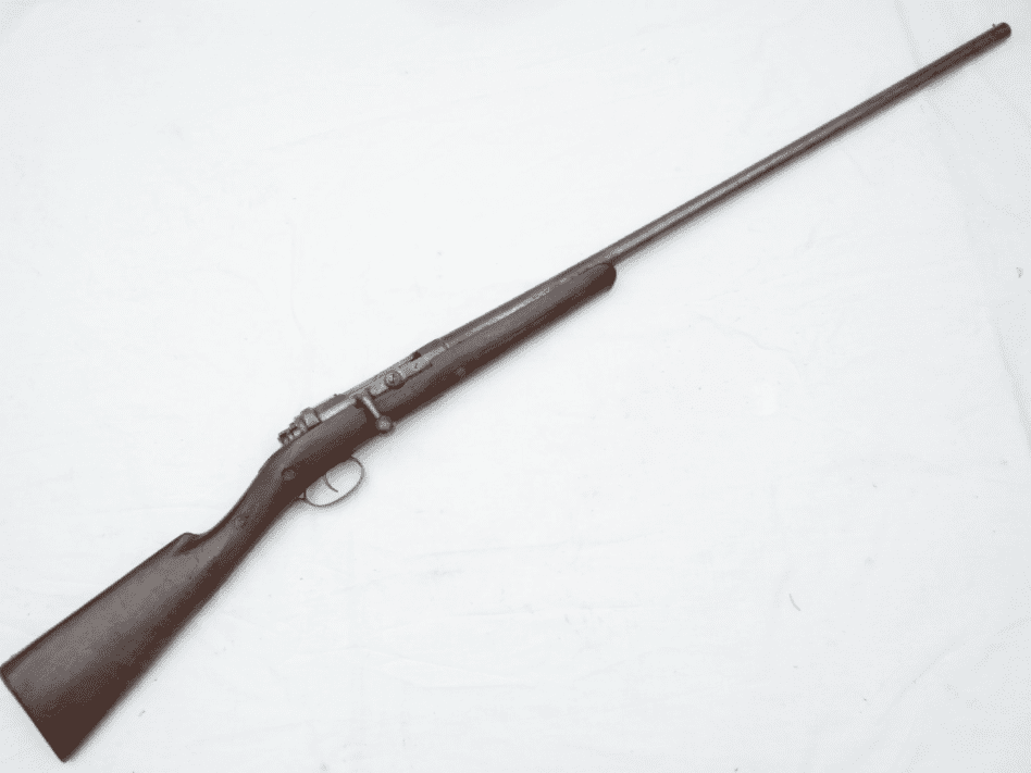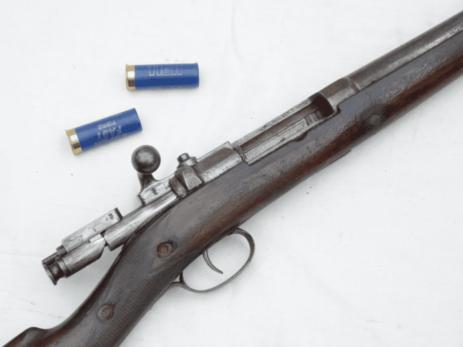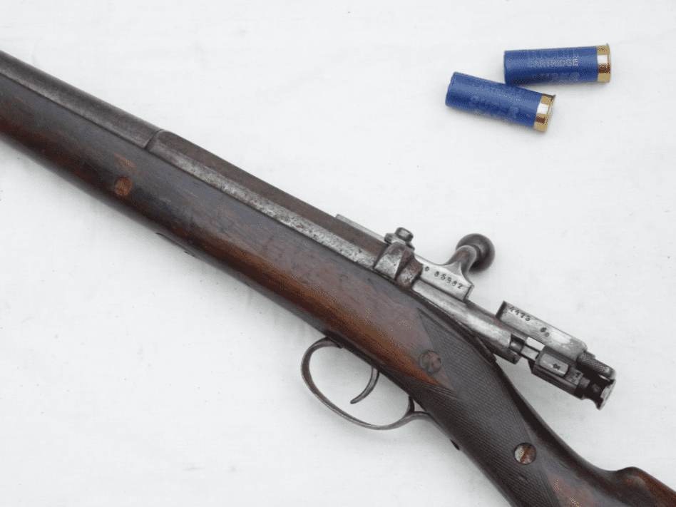 This is a very unusual 12 bore bolt-action shotgun, using the breech of a Mauser model 1871, and dated 1875 on the breech side. The breech area shows  similarity to the Steyr-Kropatschek M1886 which also drew inspiration from the M1871. Quality is typical of german weapons, with a very sturdy single-billet breech, mated up to a 31 inch barrel, lovely cross-hatched hardwood stock, though showing some cracks and easily repairable damage to rear of bolt, with steel butt-plate. An imposing and unusual hunting gun, the steel shows a pleasant patina of age with several military imperial stamps. Able to cock and dry-fire with a fully working action. Comes with a couple of inert 12g shells of your choice. Deactivated in the UK with Certificate to full UK/EU specification