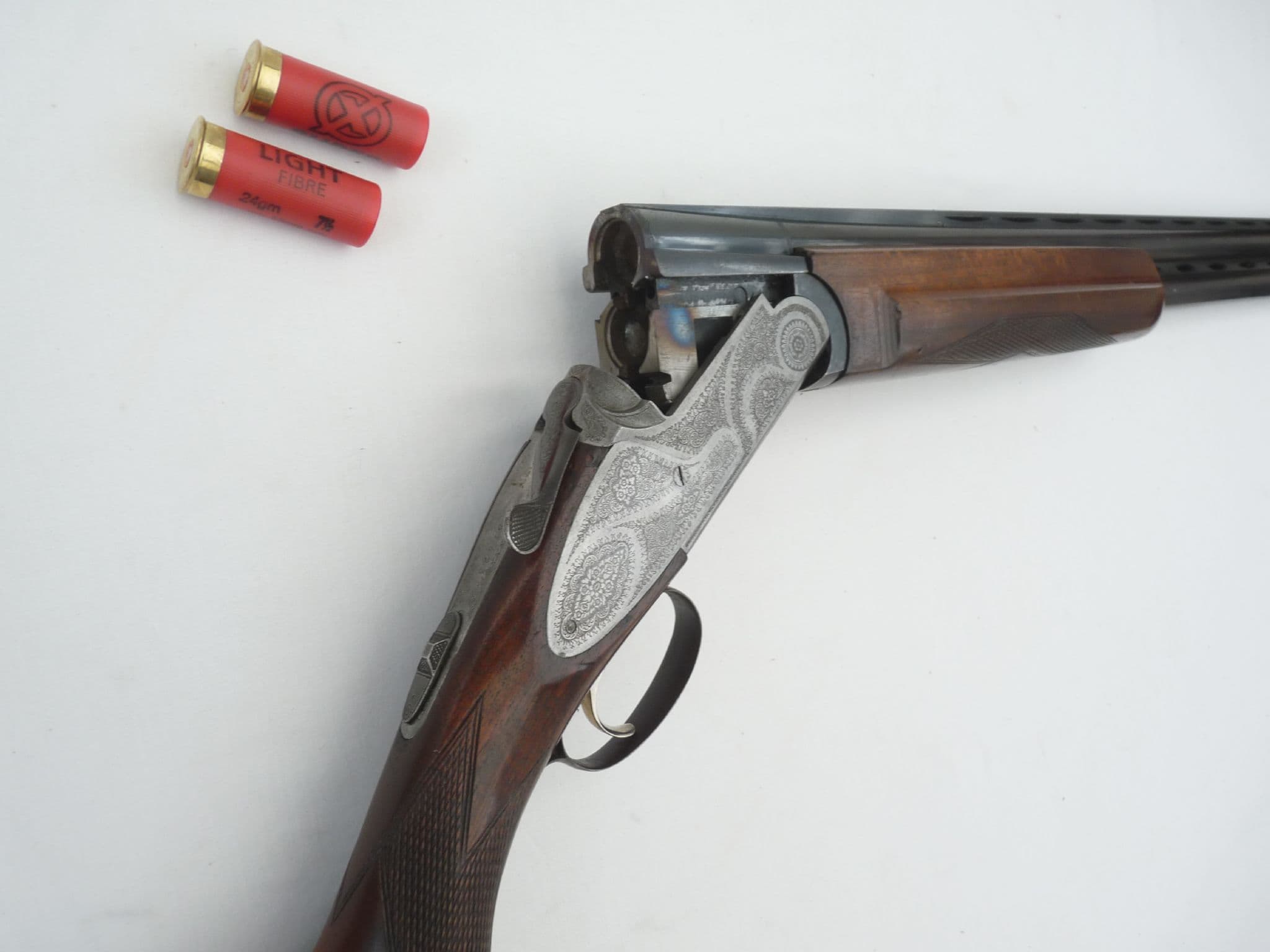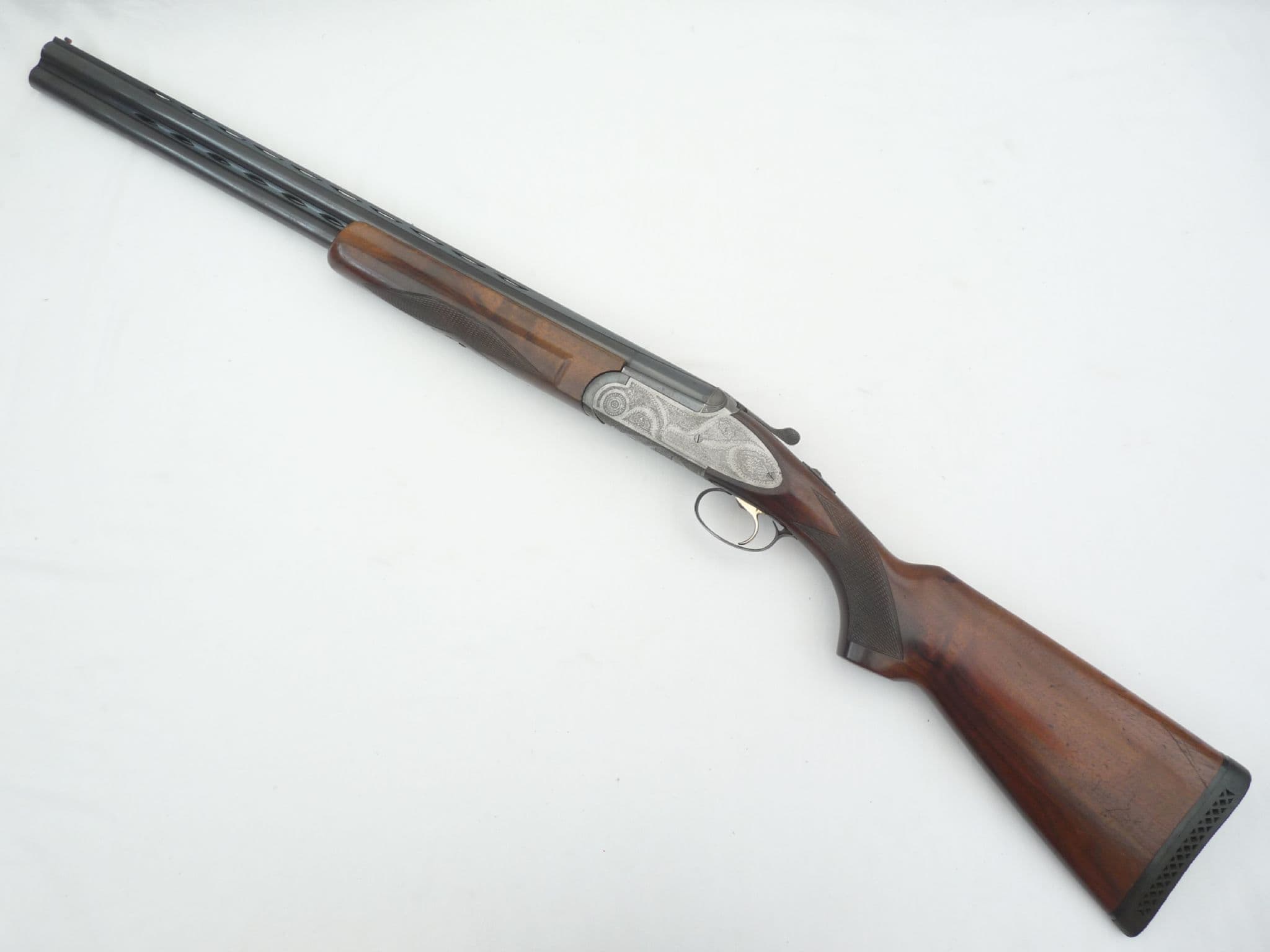 This is an Italian made Emilio Rizzini 12-bore shotgun, of 'over and under' design made in Marcheno, Brescia, Italy. This particular example is in very good condition with super hardwood stock, very good blacking to the barrels and highly engraved steel action of a 'sidelock' appearance. Maker and 'Made in Italy' marked on the side of the upper barrel. Current spec deactivation, so breaks, sprung moving trigger, but no dry-fire. Comes with two inert 12g cartridges. Deactivated in the UK to UK/EU specification with Proof House certificate.