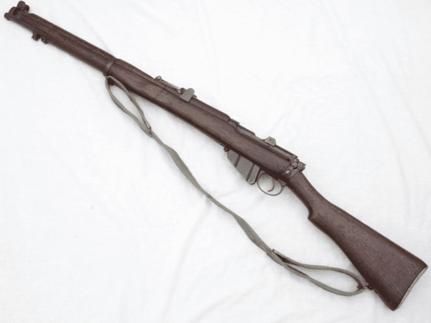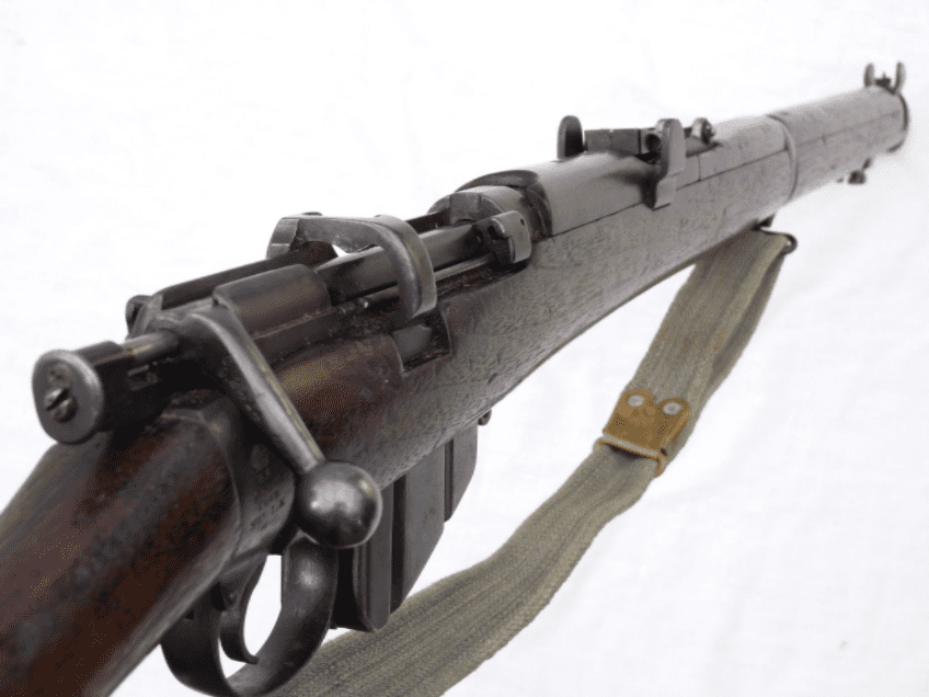 This is the standard infantry rifle of the British Army and the forces of it's Empire during WW1, the  Lee-Enfield rifle no1 mark 3*, made at the BSA Co. factory. The butt socket is clearly stamped with the Royal Cypher of George V, indicating military issue, the maker BSA, date of 1916, and the model SHT.L.E. III.  The furniture is in very good original condition, and the butt is stamped with the Canadian inspection stamp, as is the barrel and a date of '42, no serial number. The steelwork is also in very good condition, retaining nearly all of it's original blued finish, and has matching serial numbers to breech, bolt, nosecap and forestock. An authentic example of this iconic rifle perfect for the reinactor or collector alike, with a lot of history that clearly served in both World Wars. Generally known as the SMLE, this rifle cocks and dry-fires, has a detachable magazine and comes complete with brass-ended  webbing sling. Five inert .303 rounds are included with more available seperately in the 'Inert Ammunition' section at £1.50 each. Deactivated in the UK with Certificate to UK specification.