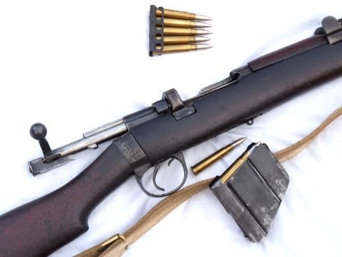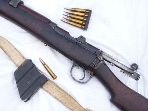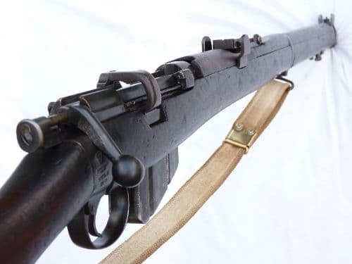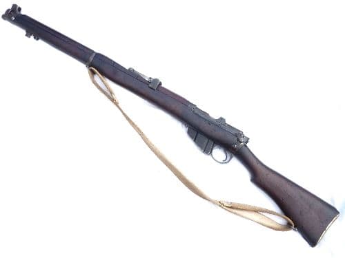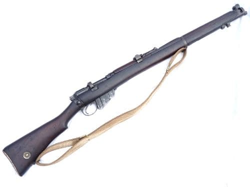 This is the standard infantry rifle of the British Army and the forces of it's Empire during WW1, the  Lee-Enfield rifle no1 mark 3*, made at the Enfield factory. The butt socket is clearly stamped with the Royal Cypher of George V, indicating military issue, the maker Enfield, date of 1918, and the model SHT.L.E. III*.  This rifle has all genuine furniture in lovely complete and authentic condition, although the rear-most upper handguard looks to have been replaced (these were prone to splitting), with brass butt-disc. The  metalwork is also in excellent condition, retains nearly all of it's original blued finish, and of most importance has all matching serial numbers to forestock, breech, barrel, bolt, rearsights and nose-cap making this a truly original and unmessed with example of this iconic rifle perfect for the reinactor or collector alike. Generally known as the SMLE mk3, this rifle cocks and dry-fires, has a detachable magazine and comes complete with correct  brass-ended  webbing sling. Five inert .303 rounds are included with more available seperately in the 'Inert Ammunition' section at £1.50 each. Deactivated in the UK with Certificate to UK specification.