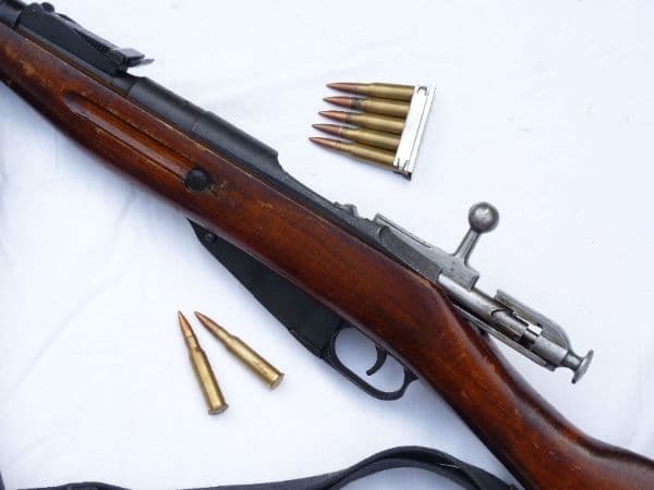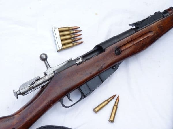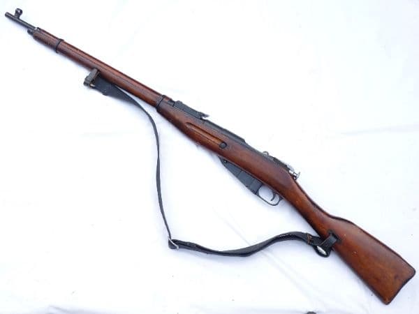 The standard infantry rifle of the Red Army during WW2, this is the Mosin-Nagant model 1891/30. The 1891 relates to it's first production date, and the 30 relates to its final modification date of 1930. This example is dated 1942 on the receiver, and is one of the many Russian Armoury refurbished rifles that were put into storage after WW2. Good hardwood laquered stock and excellent blacking to the steel, with just the odd knocks and bruises as would be expected on a service rifle. The breech is stamped with the Izhevsk Arsenal mark, the Soviet Hammer & Sickle, manufacture date and the serial number, matched to the rest of the rifle.  Of interest is the early style sling point on the butt. Cocks and dry fires, fully strippable  and complete with naval issue sling. Deactivated in the UK with Certificate to UK specification. Bayonet available for £20 if required.
