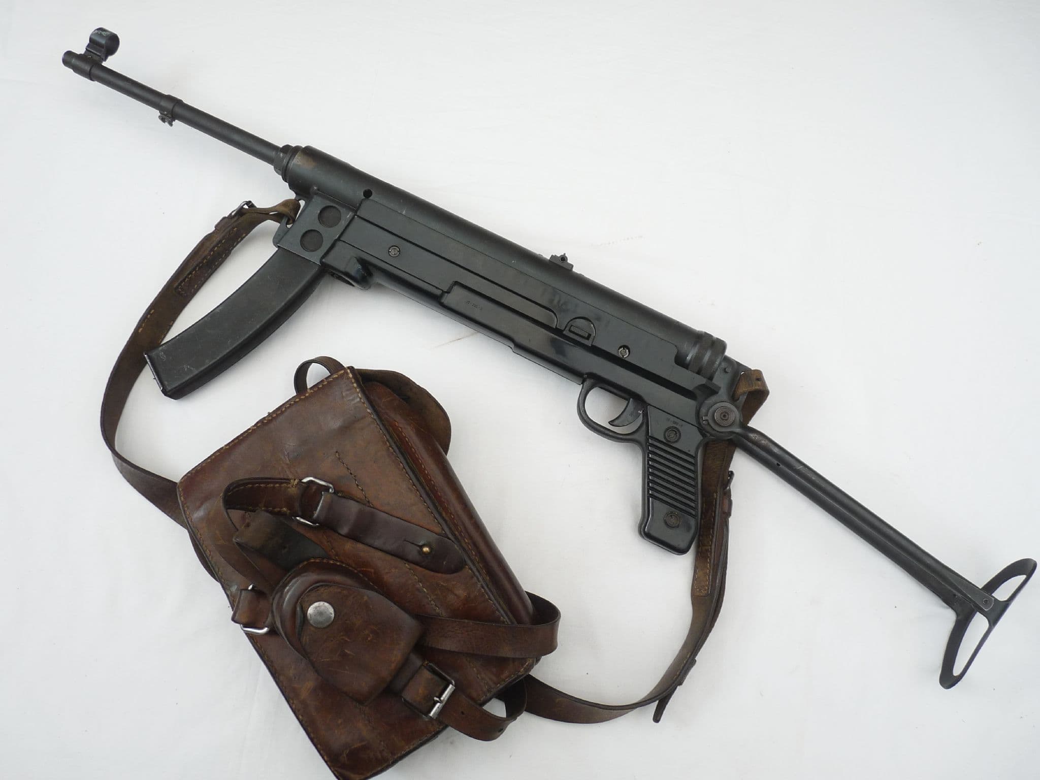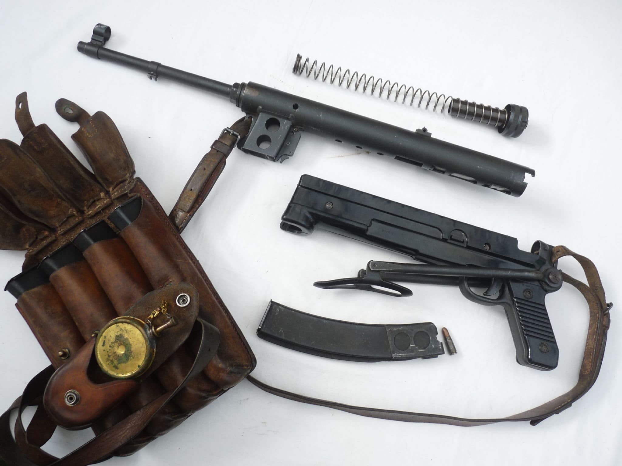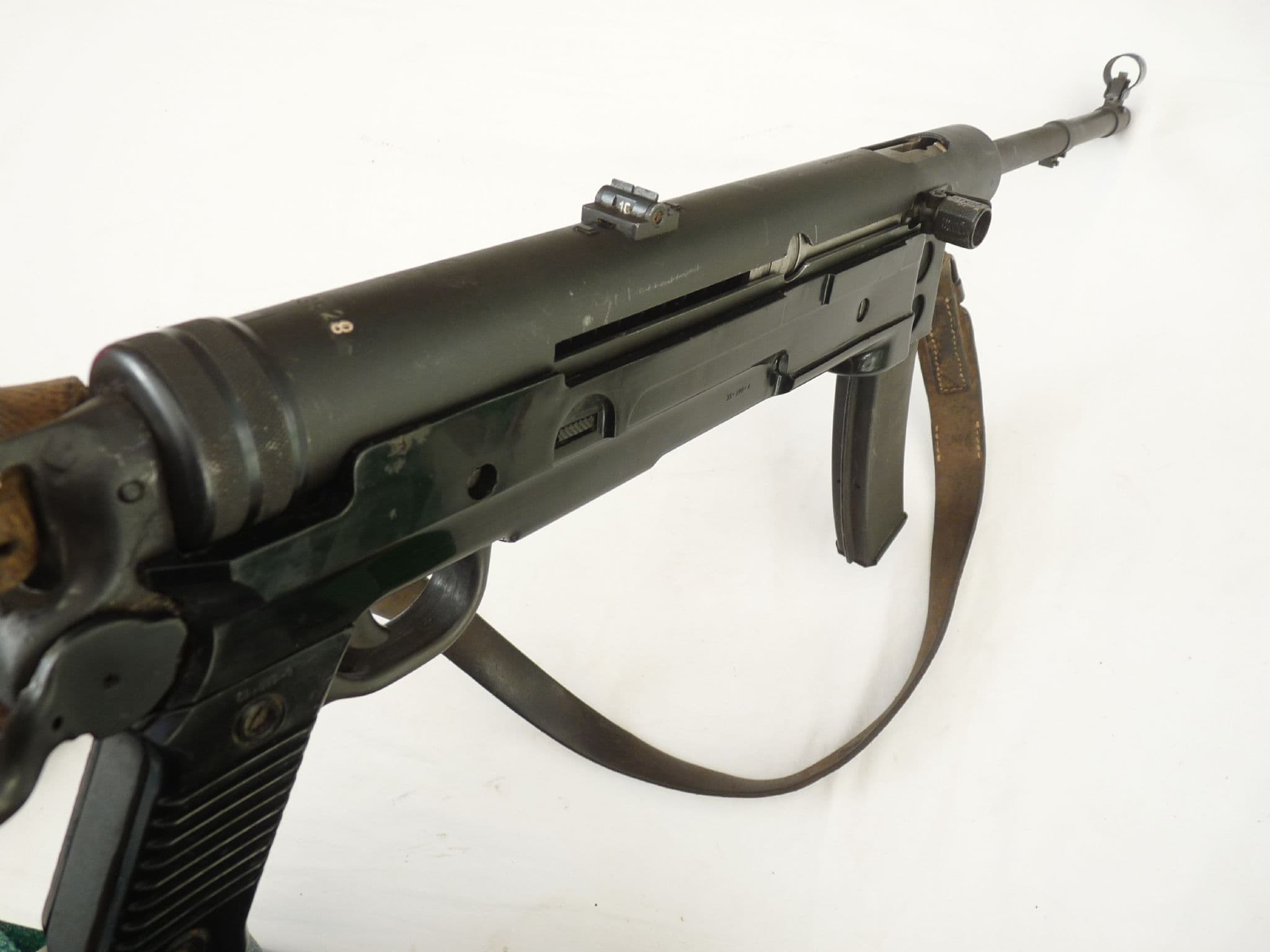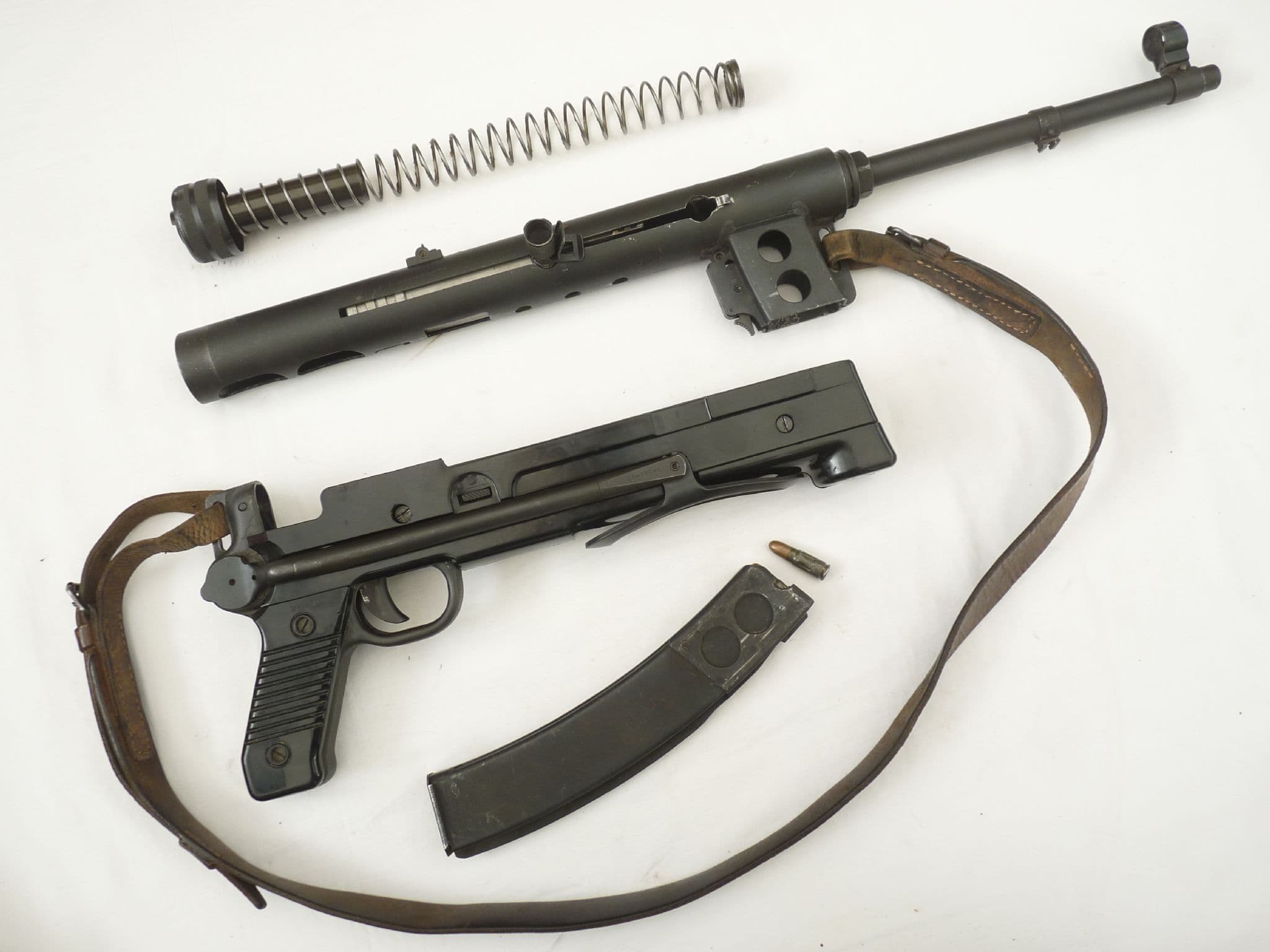 This is a deactivated Yugoslavian M56 smg, which saw service with the Yugoslav military from 1956 (hence name) through to 1992. Chambered for the Russian 7.62 x 25mm cartridge, the design was clearly influenced by the German WW2 MP40, though it has many differences. This example is in very good condition with moving cocking handle and bolt under spring pressure, with the benefit of having a partial original bolt, not a facsimile. With sprung trigger, folding butt-stock and original leather sling, it can be stripped down as shown. Also comes with 3 spare magazines in an original leather pouch plus cleaning kit, and a couple of inert 7.62mm cartridges. Deactivated in the UK with proofhouse certificate of deactivation.