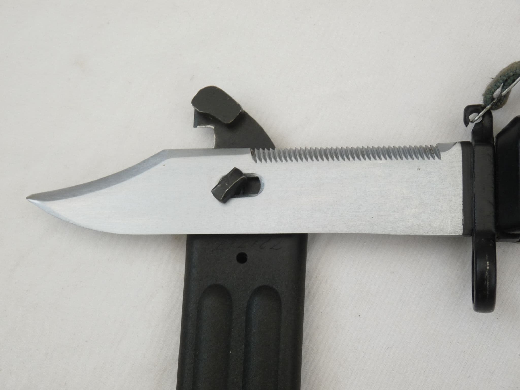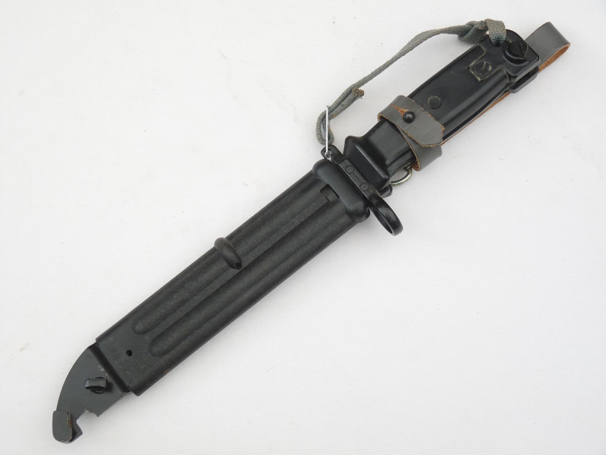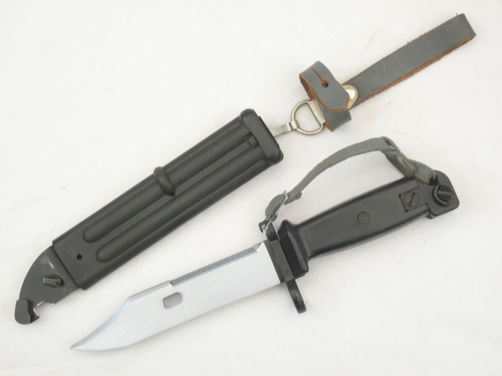 This is a communist East German made bayonet and scabbard, designed to fit the Russian Kalashnikov AKM assault rifle. A very useful tool, not only a good fighting knife, but also doubling as a wire-cutter when the blade is engaged with the scabbard. This is a Type 2, which came out in the mid-1960s. An improvement on the earlier Type 1, it had a steel pommel rather than the earlier less resilient plastic one, and a fully plastic scabbard rather than a steel one.  In excellent condition with excellent blade, and perfect scabbard with no loss of finish, and no cracking to grey leather. Matching etched serial numbers to bayonet and scabbard.