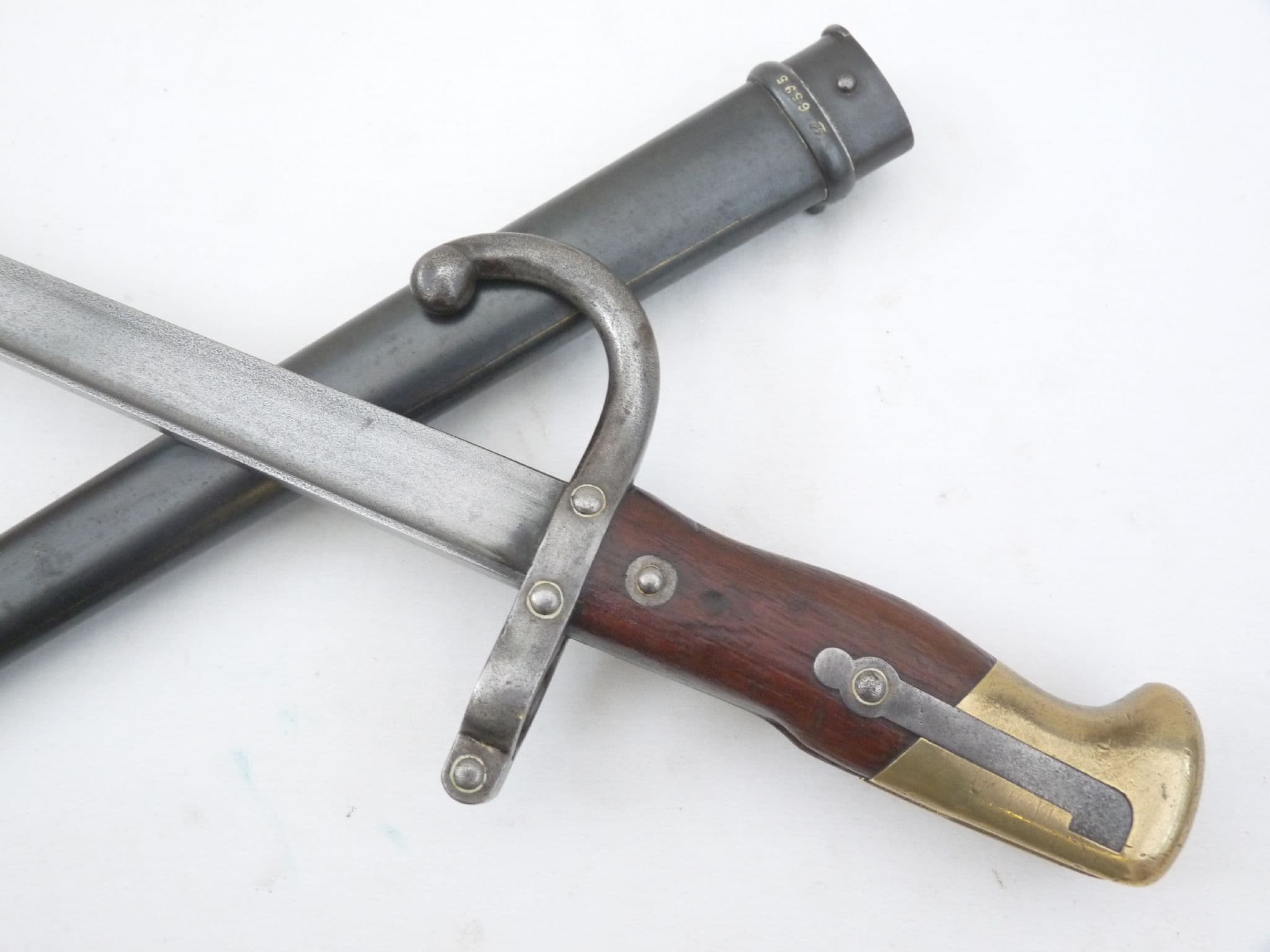 This is the French T-back or T-section bayonet as fitted to the Gras M1874 rifle, unusually made at the Austrian Steyr factory. The blade is in very good clean condition, with very good edge and point. Marked on the spine with the Steyr armoury and a date of 1877, in french of course. Good wooden grips with brass pommel and sound working release button, OEWG marked. Very nice undented scabbard with excellent blacking. A very nice bayonet that is over 140 years old!