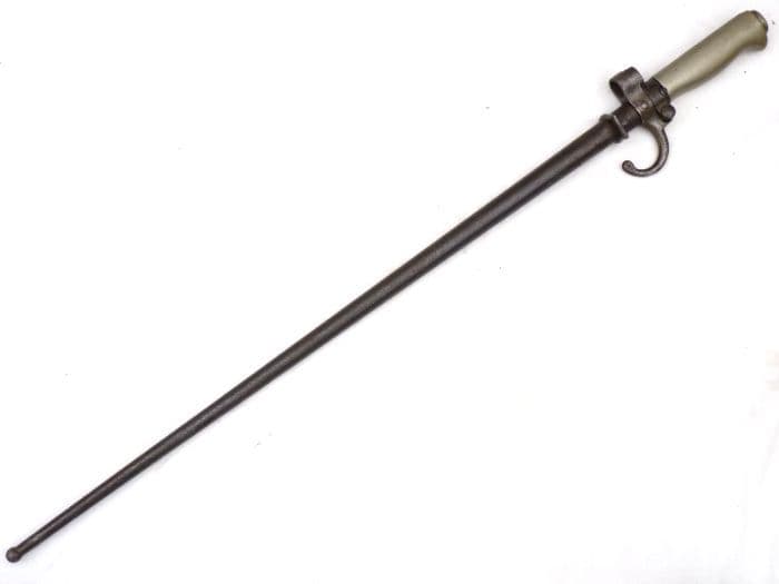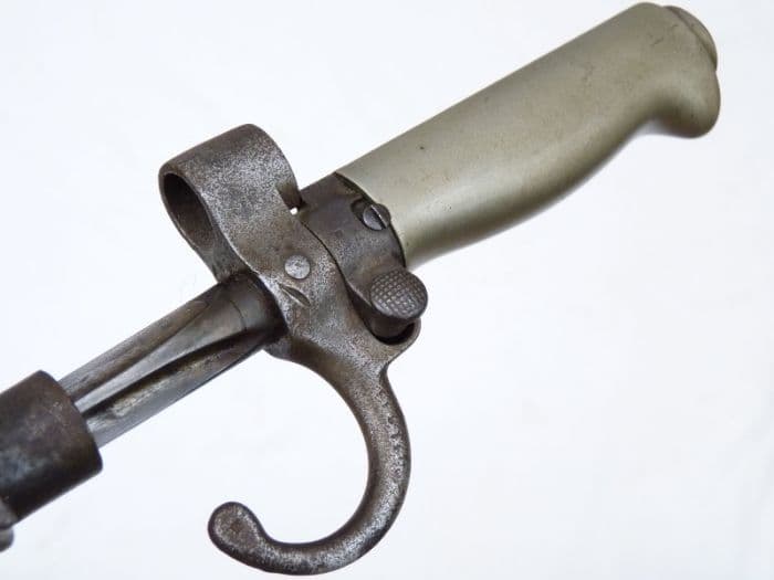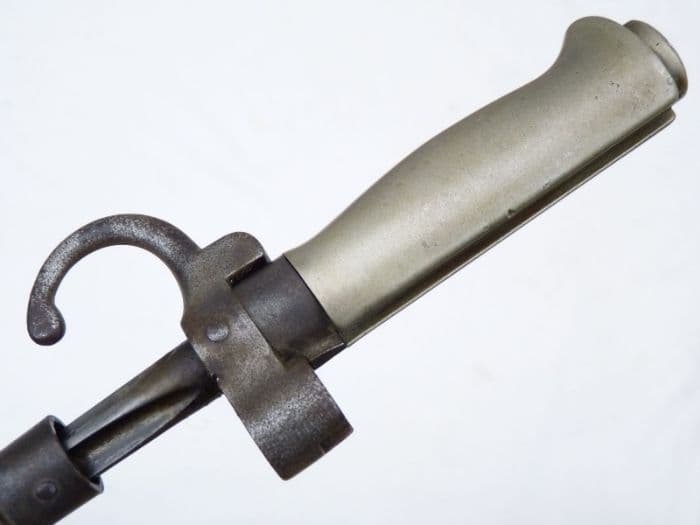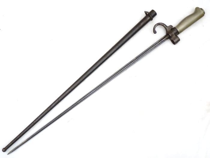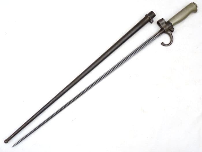 This is the cruciform type 'epee' bayonet as fitted to the Lebel M1886 and Berthier M1907 rifles that equipped the French Army, and those of it's colonies, during WW1. Introduced in 1886, this bayonet featured a hook quillon which soon disappeared during WW1 in an attempt mainly to shorten production time, and the cupro-nickel handle was replaced with a brass one for similar reasons. This particular example is in good sound condition. The full 52cm long blade is unbent and uncorroded. The scabbard is quite straight with no dents, and the blade slides in smoothly. Light pitting to the steel of the scabbard. Lovely near perfect nickel grips.  A super early WW1 bayonet to compliment your Lebel or Berthier.