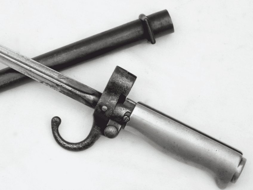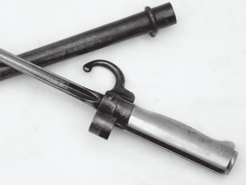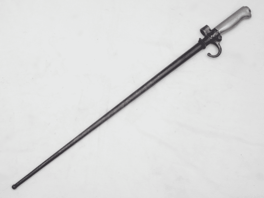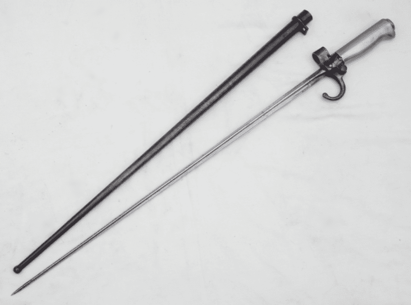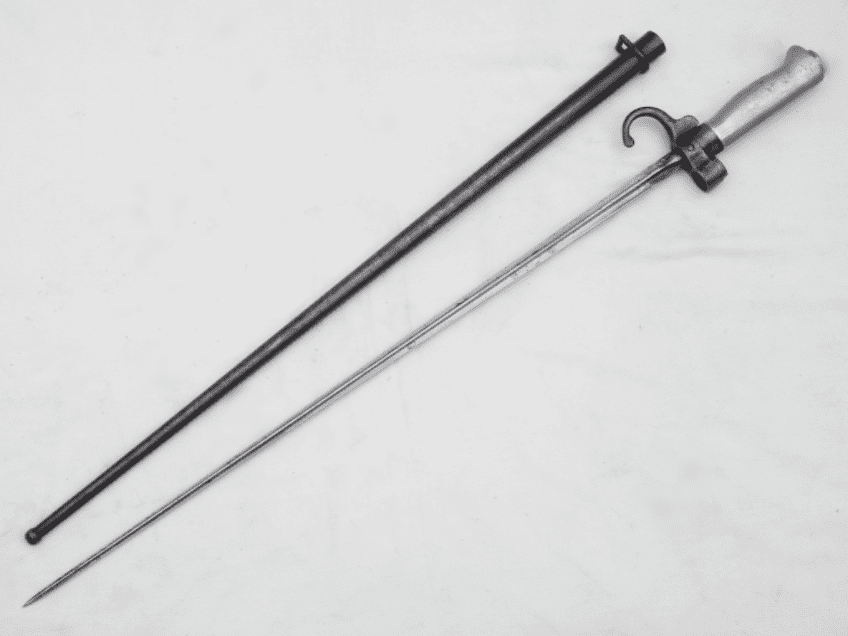 This is the cruciform type 'epee' bayonet as fitted to the Lebel M1886 and Berthier M1907 rifles that equipped the French Army, and those of it's colonies, during WW1. Introduced in 1886, this bayonet featured a hook quillon which soon disappeared during WW1 in an attempt mainly to shorten production time, and the cupro-nickel handle was replaced with a brass one for similar reasons. This particular example is in good sound condition. The full 52cm long blade is in good clean straight condition with minor marking. The scabbard is straight with no dents, the blade slides in smoothly, and most of the original finish remains with very minor corrosion. Very good nickel grips, good release button and only light pitting to crossguard and quillon.  A nice early WW1 bayonet to compliment your Lebel or Berthier.