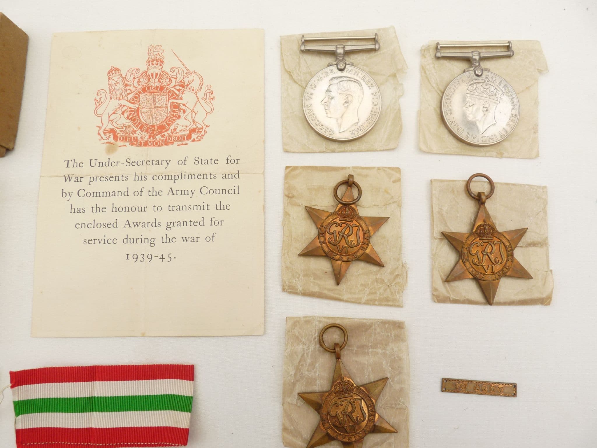 This is a genuine set of campaign medals awarded to a infantryman in the 1st Army, complete with award certificate confirming the awards, and the box of issue, which would allow some research to be done on this lovely set. Comprising the British War Medal, the Defense Medal, the 1939-45 Star, the Africa Star with 1st Army clasp, and the Italy Star. This infantryman clearly saw a lot of action. All in excellent unworn condition as issued, unused genuine ribbons and all of the five medal packets.