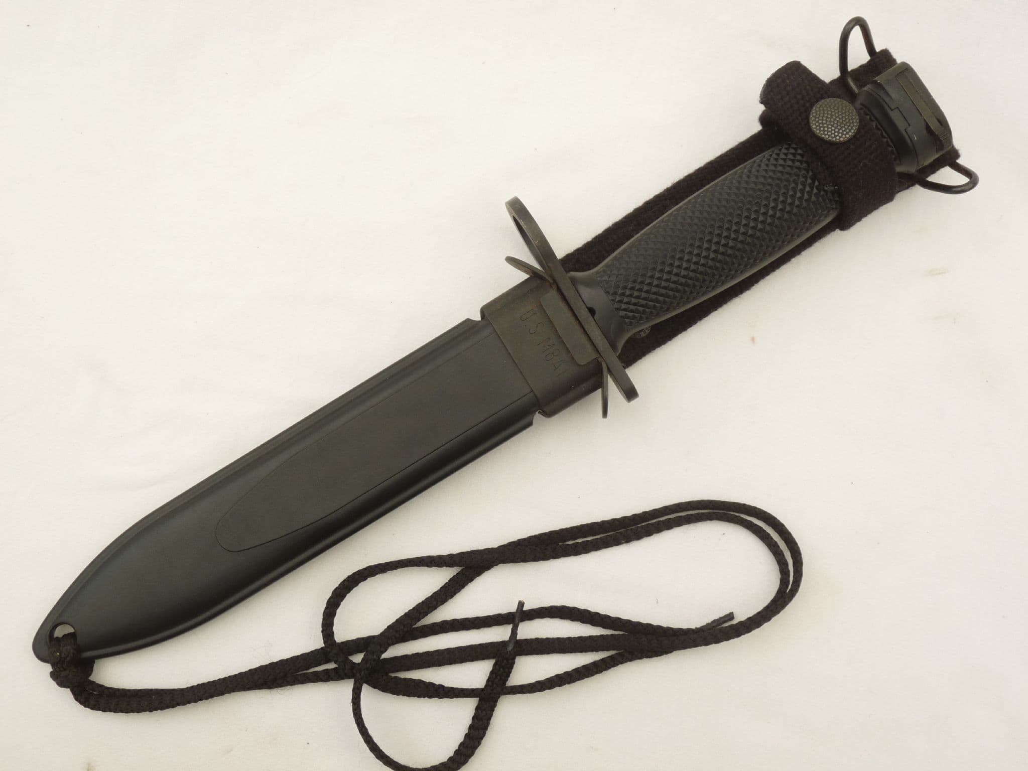 This is a German made M7 bayonet as fitted to the Colt M16 and AR-15 assault rilfes. In near mint condition with perfect blade and grips, marked US M7 under the crossguard and Made in Germany on the ricasso and a faint Colt logo on the blade, it is probably made by Eickhorn of Solingen. Note: not West Germany, so a production after 1990. Excellent undamaged black plastic M8A1 type scabbard and black webbing frog, encorporating  US-style wire hanger attachment, with thigh strap.