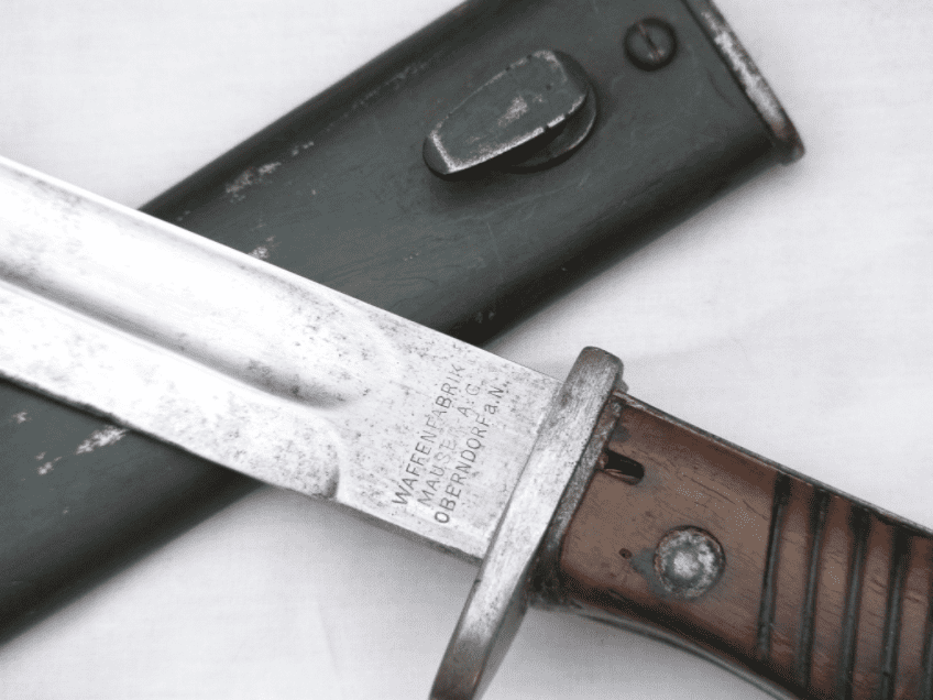 This is the infamous 'Butcher' bayonet as used by the front-line troops of the German Army during WW1. Full designation for this bayonet is S (Seitengewehr meaning side-arm) 1898/05 n/A. 1898 being the year of introduction of the basic bayonet and 1905 the year of modification to that current form. n/A stands for 'neuer Art', meaning 'new type' or 2nd type, due to reduced muzzle ears and flashguard above the grips. Production of this n/A bayonet ran from 1915 to 1917 only. This particular example is in very good condition, with excellent edge and point, and only minimal marking on the steel. Minimal corrosion to crossguard or pommel, and good wooden grips with only a small bit of damage on one side. Marked Waffenfabrik Mauser A.G, Oberndorf a.N, on one side of the ricasso, and 15 under the imperial crown of Wilhelm on the spine. The scabbard is complete and undamaged with no dents, also faintly inspection marked on the lip. A very desirable WW1 bayonet in lovely condition, made by the most famous maker.