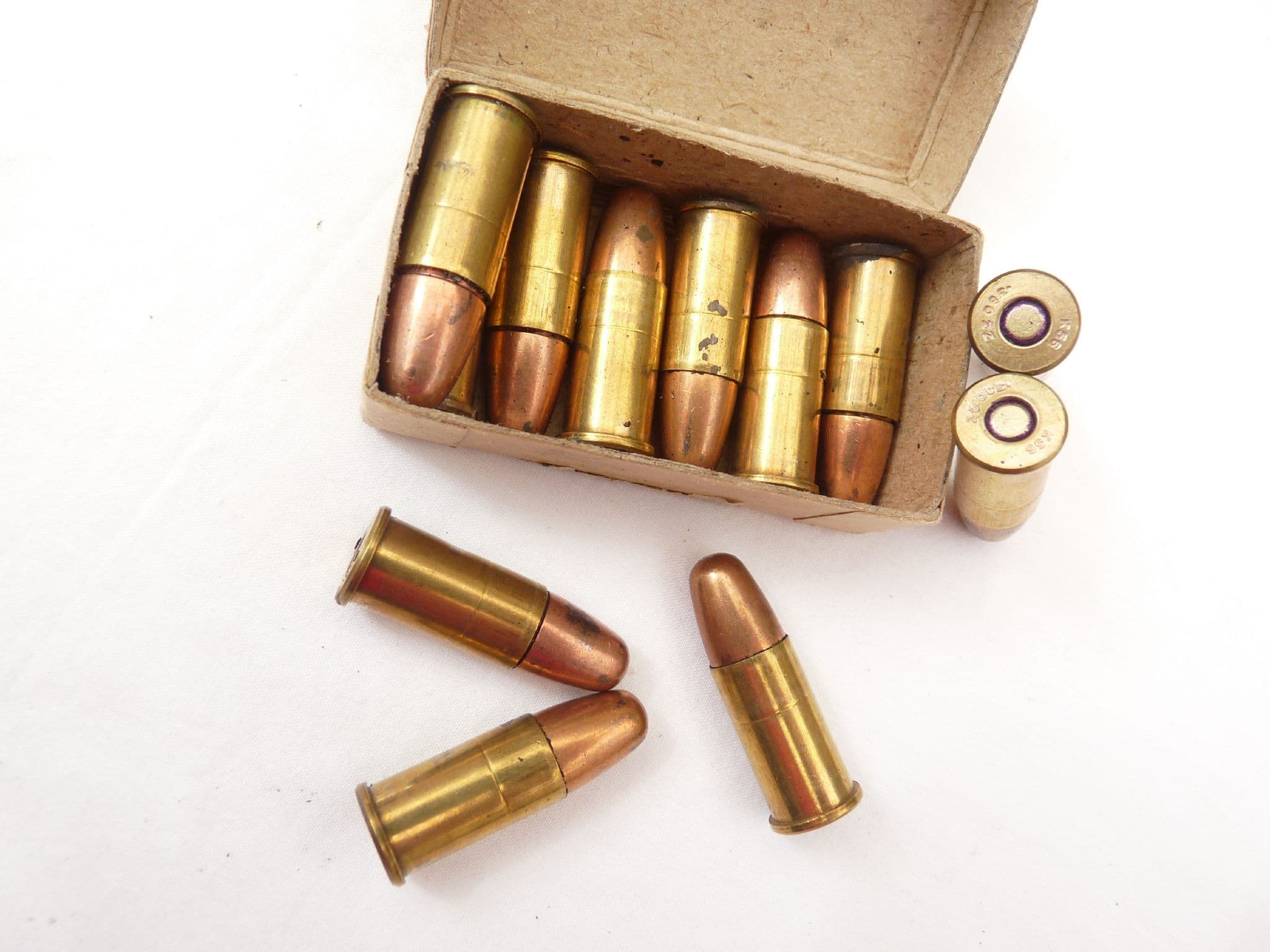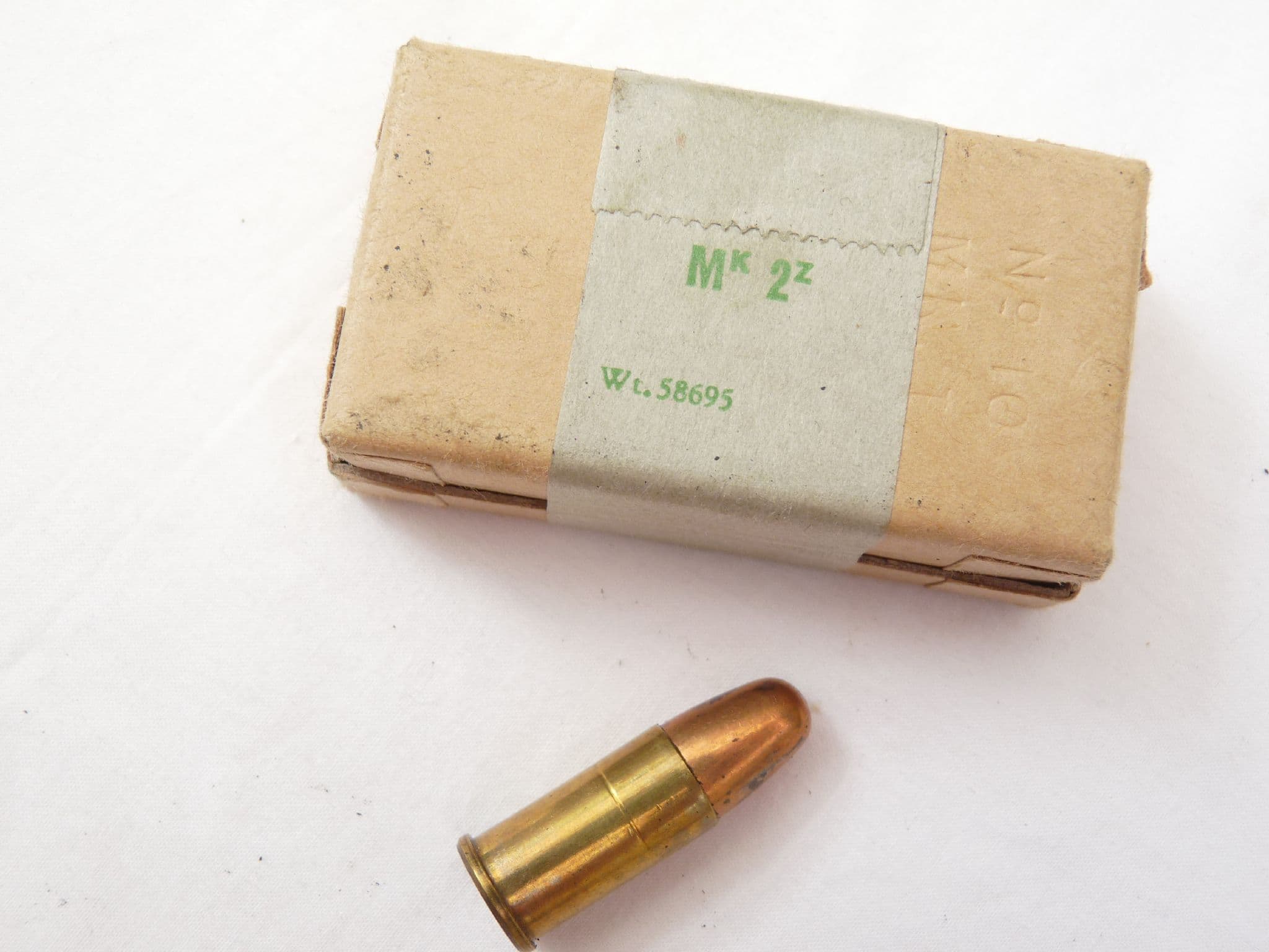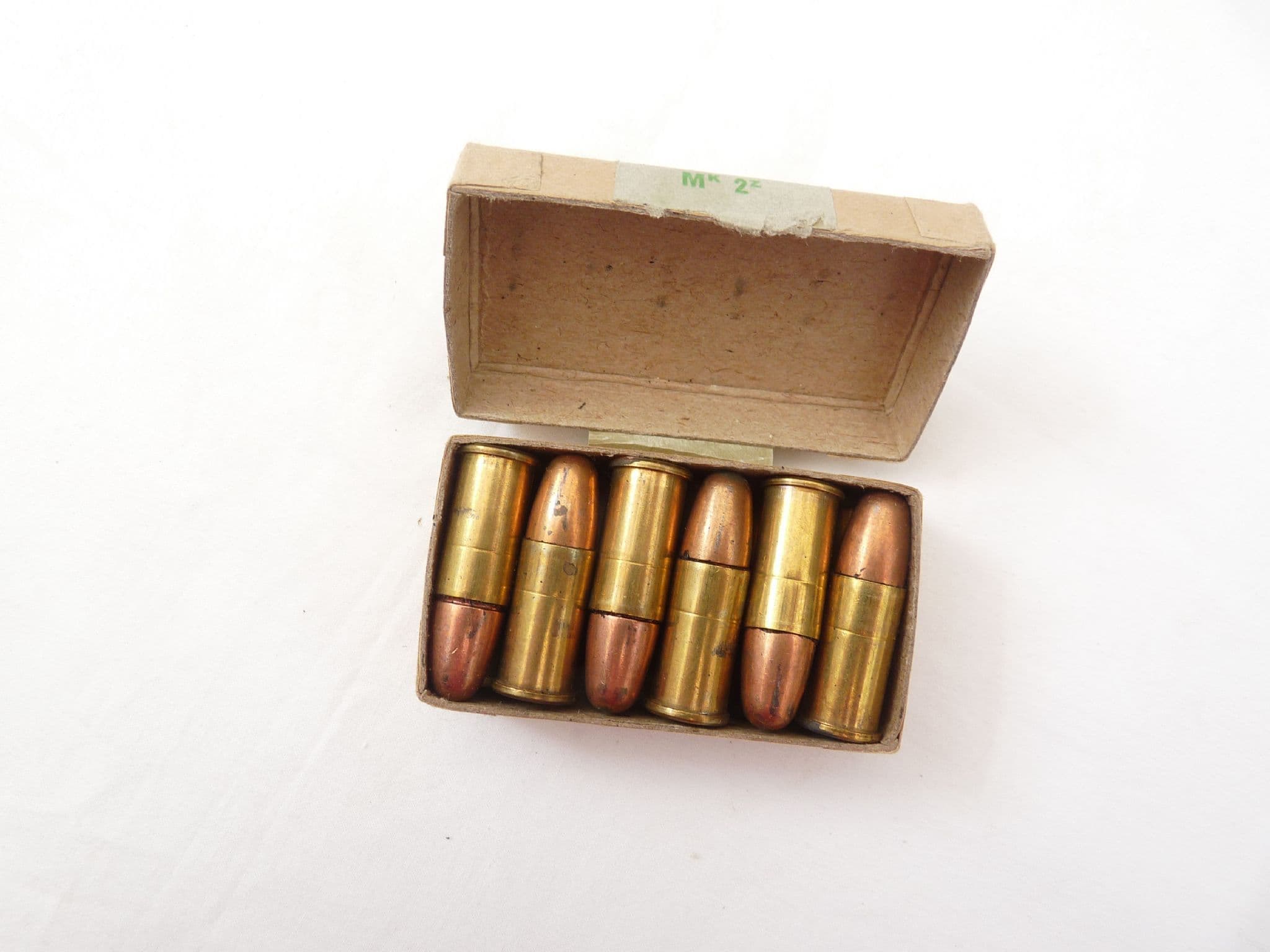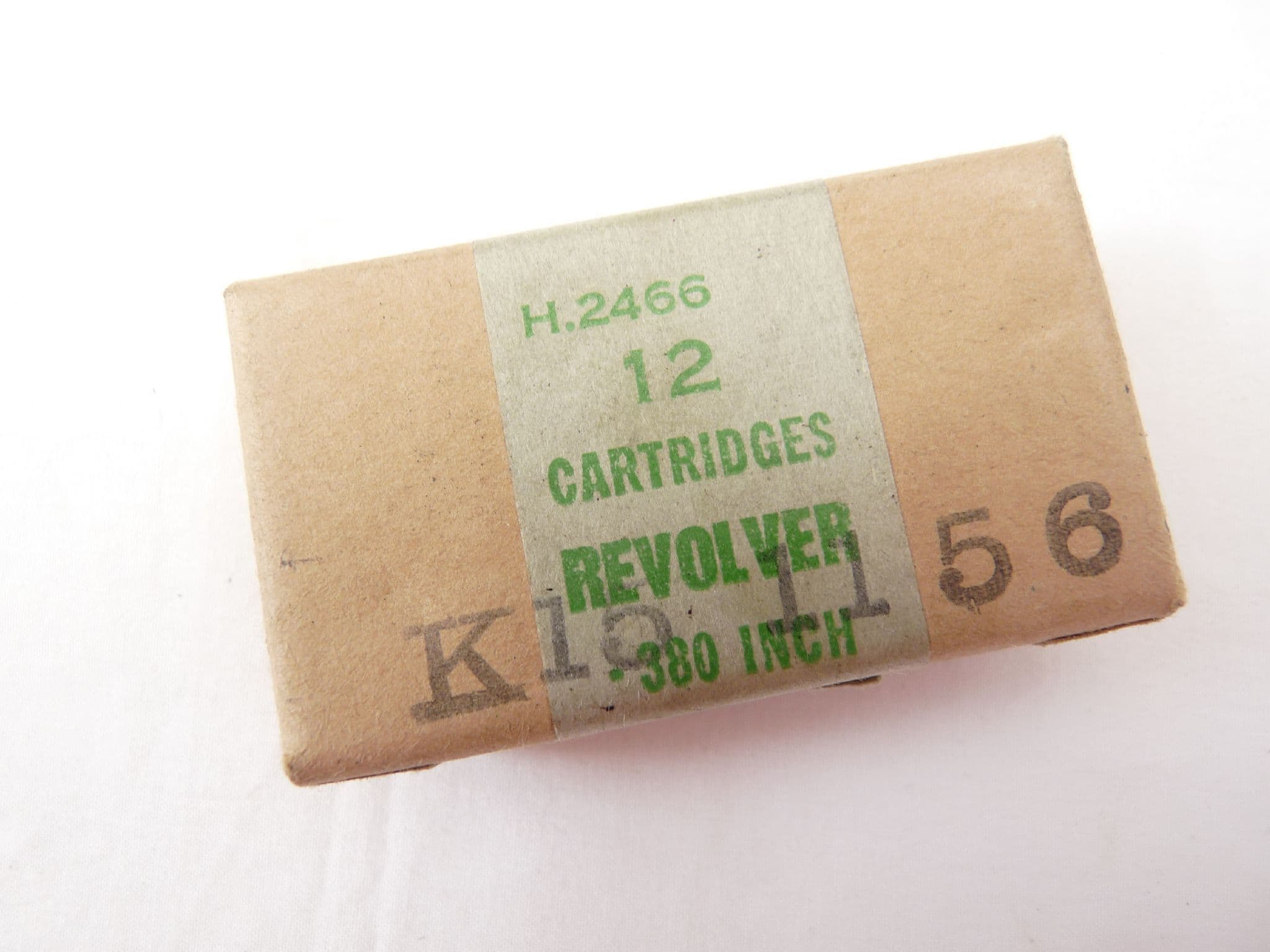 This is a box of 12 inert and totally safe 0.38 Smith and Wesson cartridges, as issued to the British army post-war, marked .380ZZ and dated 55 on the headstamp, with unstruck primers (primer is oiled and a ball bearing is put in the case to signify it isn't live). The .38 S&W was named after it's designers, and developed for use as a revolver cartridge in 1877. The British military used a derivative, designating it the 'Cartridge, S.A., Revolver Ball, 380 in, MkI .38-200, with the "200" referring to the weight of the head measured in 'grains'. In 1937, this cartridge was replaced by the Cartridge, S.A., Revolver Ball, 380 in, MkII, fitted with copper jacketed heads after solid lead 'dumdum' type bullets were banned.