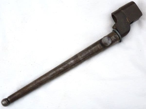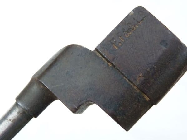 This is a British made spike bayonet for fitment to the Lee-Enfield rifle no4 and all it's marks. Rather gruesomely known as the 'pig-sticker', this bayonet is marked No4 MKII* P.S&S.Ltd (for Prince-Smith & Stells of Keighly, Yorkshire) faintly on the left side, and more boldly F.F&S.Ltd for Fred Fisher & Sons, on the right side, who were contracted to forge the bayonet socket. Also broadarrow marked. It is a variant of the Mk2, designated MK2* , the '*' suffix denoting a two piece construction with separate blade rather than one piece, to assist in speed of manufacture. Excellent blade and point, though minor marks from damp, good undented scabbard.