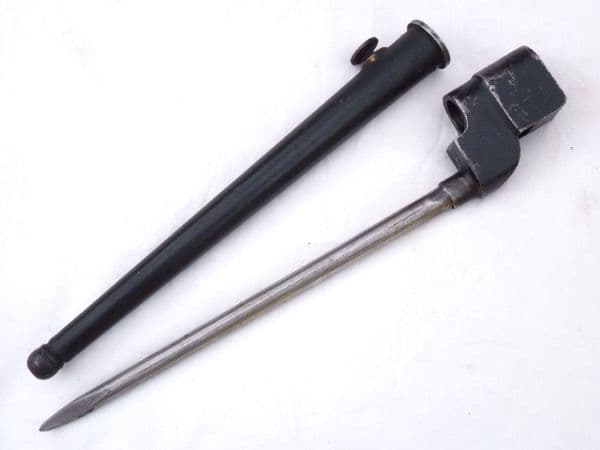 This is a British made spike bayonet for fitment to the Lee-Enfield rifle no4 and all it's marks. Rather gruesomely known as the 'pig-sticker', this bayonet is faintly marked No4 MkII* P.S.K, for Prince-Smith & Stells & Co.Ltd, Keighly, Yorkshire, who were contracted to forge the bayonet socket. Also broadarrow marked on the socket. It is a variant of the Mk2, designated MK2* , the '*' suffix denoting a two piece construction with separate blade rather than one piece, to assist in speed of manufacture. Excellent blade and point, excellent undented scabbard.