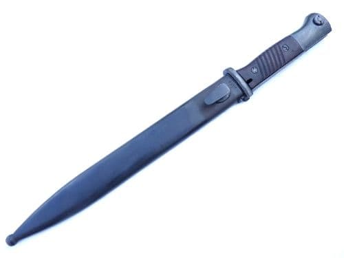 This is a Model 1884/98 III bayonet for the WW2 German Mauser K98 infantry rifle. Marked 43 fnj on the ricasso, and also on the scabbard, (1943 manufacture by Alexander Coppel of Solingen) but non-matching serial numbers, this bayonet is in good sound condition, with most of the blued finish to the blade, good point and unsharpened edge. Most of the original blued finish still present on the crossguard, flashguard and pommel, with Waffenamt stamps on pommel. The bakolite grips are near perfect. Very good scabbard, no dents and 99% of it's original finish left, Waffenamt stamped finial. A great addition to any K98 rifle.