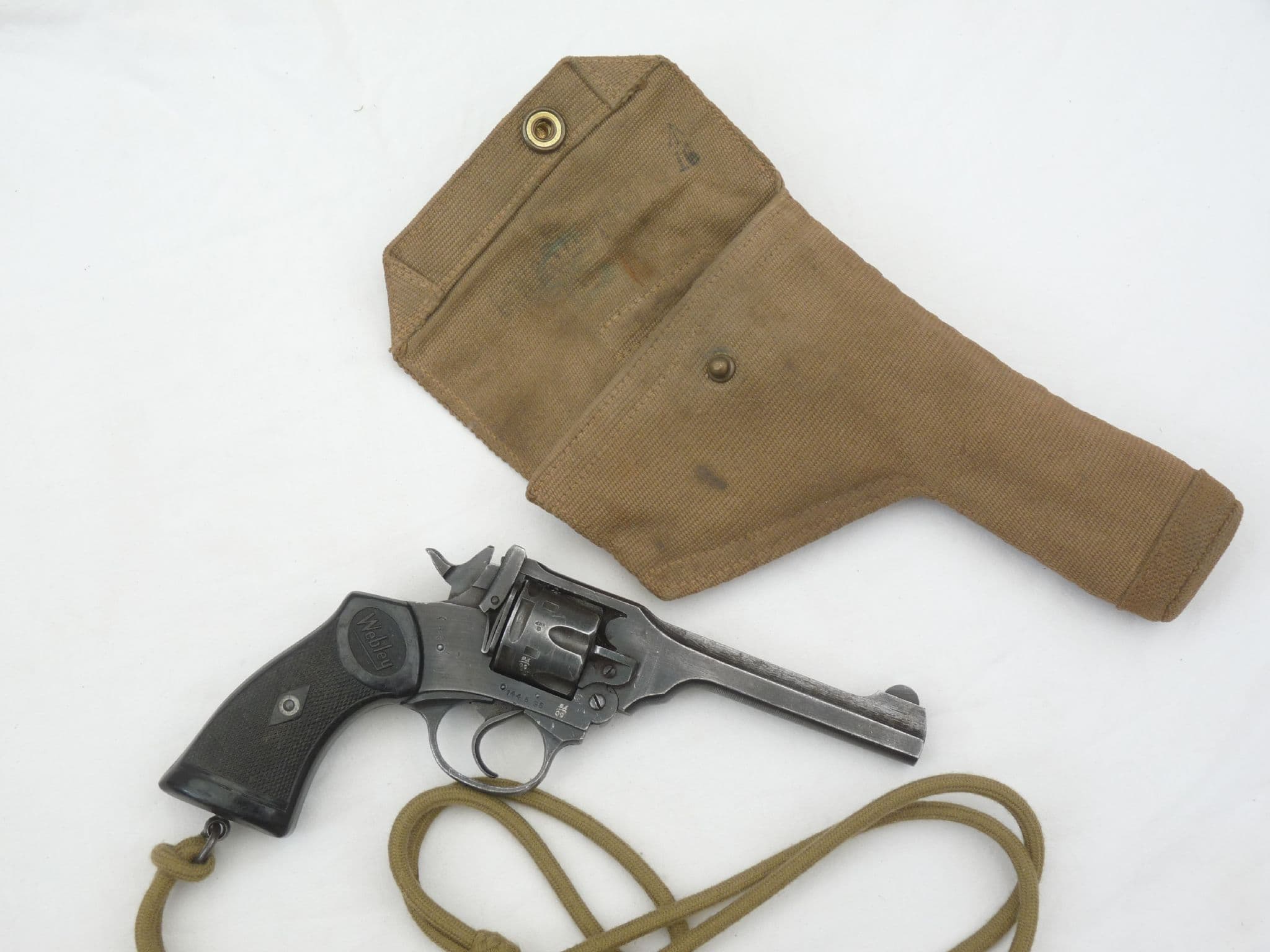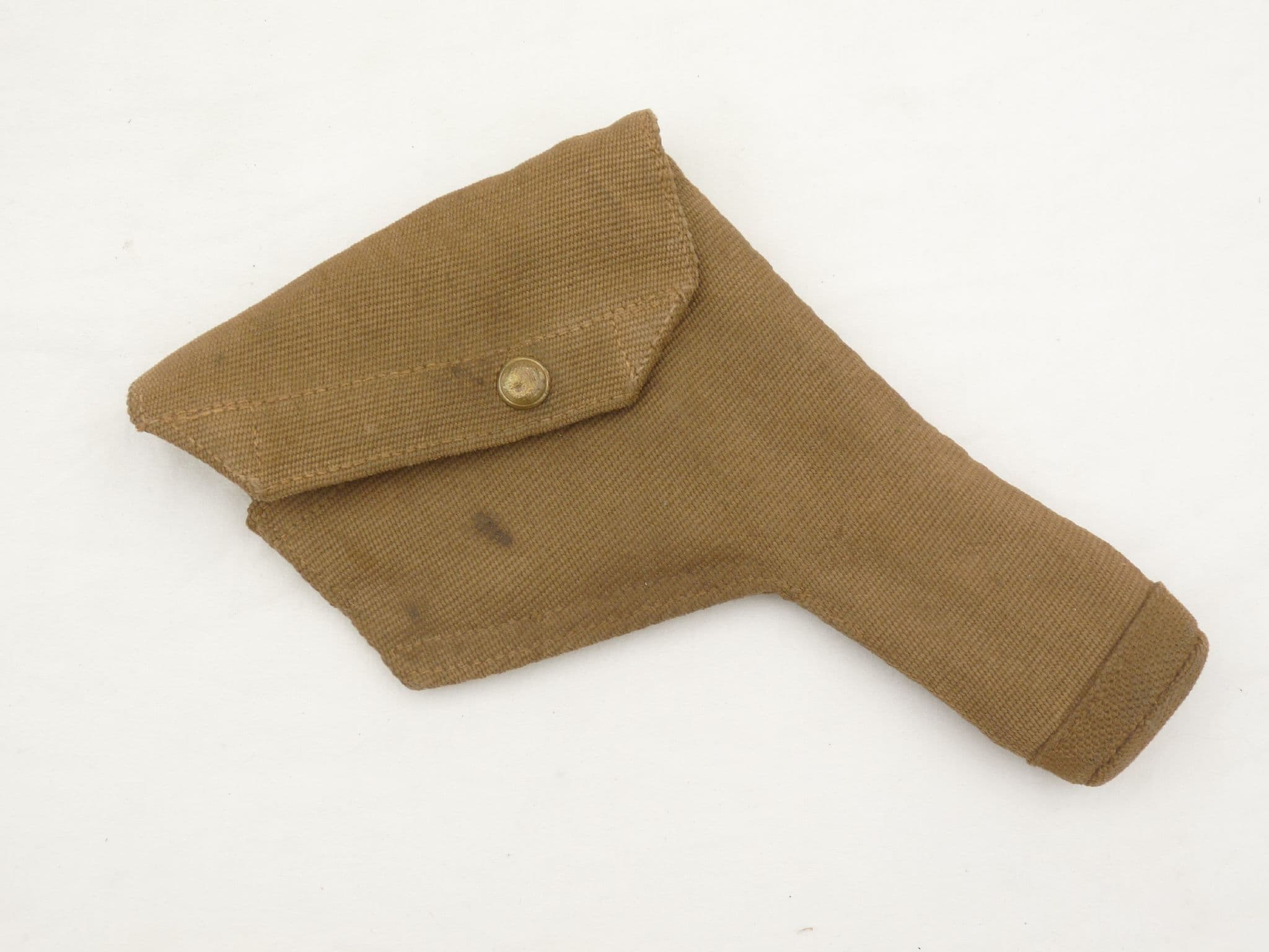 A WW2 dated Patt 37 khaki webbing holster for the standard Webley service revolver in very good used condition. There are minor marks but no damage to this holster, faintly maker marked and dated 1943 under the flap with broadarrow.