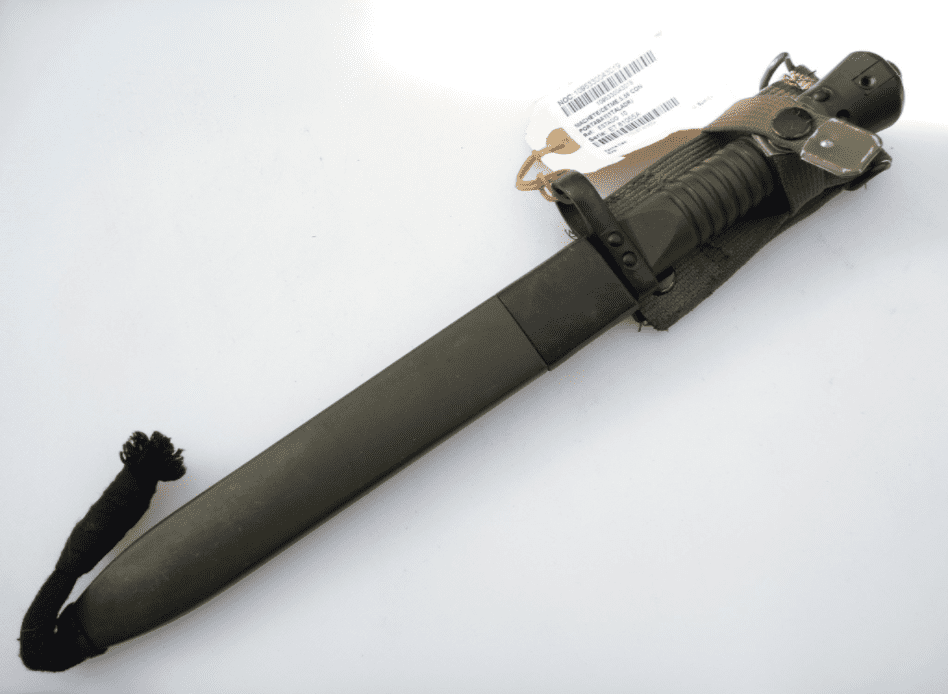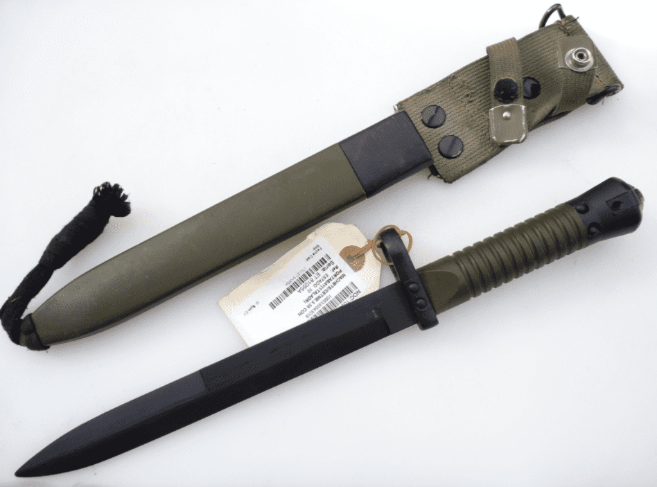 This is a bayonet for the Spanish made Cetme model L 5.56mm calibre assault rifle. In excellent unissued condition with perfect blade, it still has it's store label attached to the muzzle ring. Excellent scabbard with integral webbing frog.