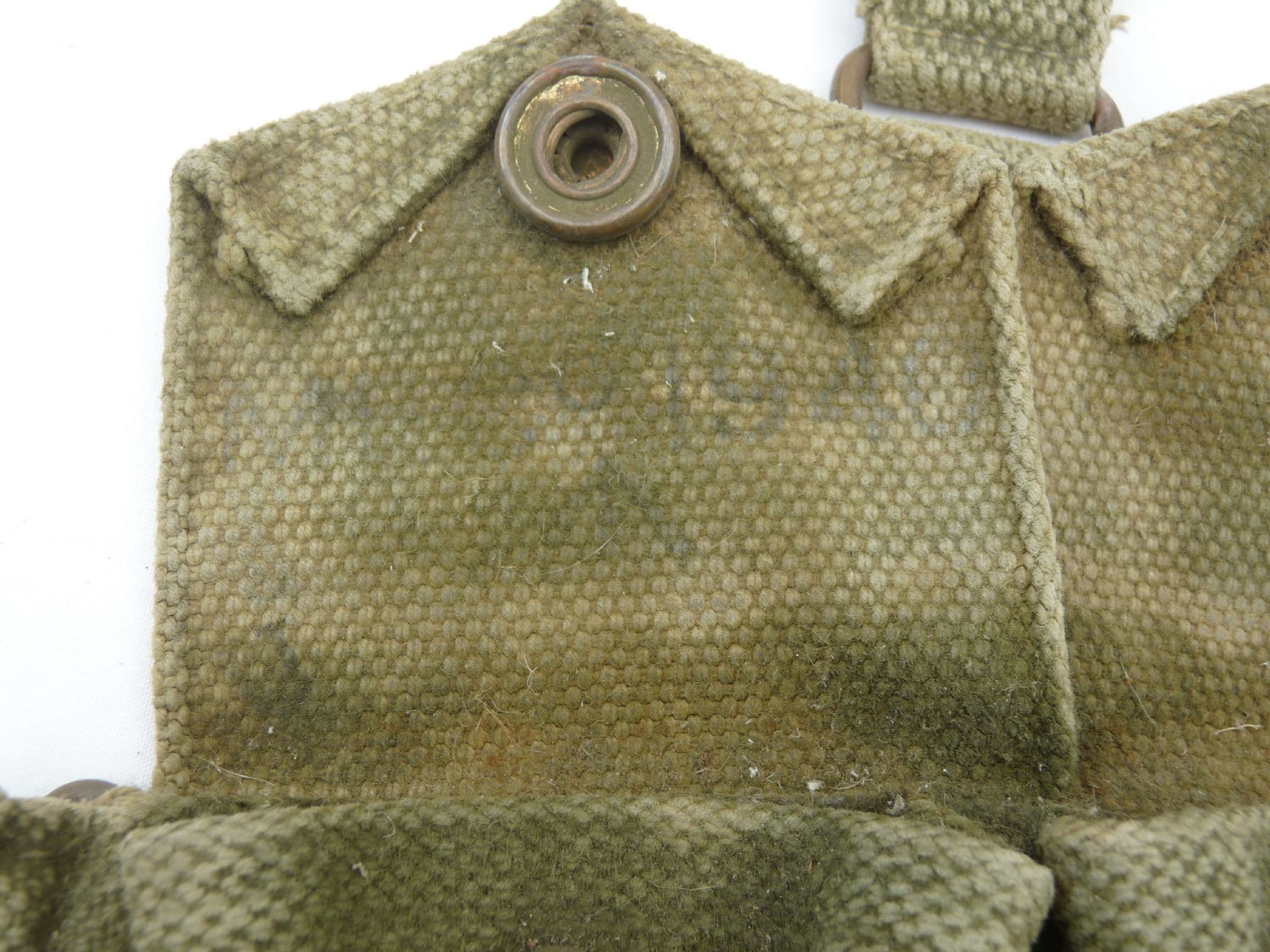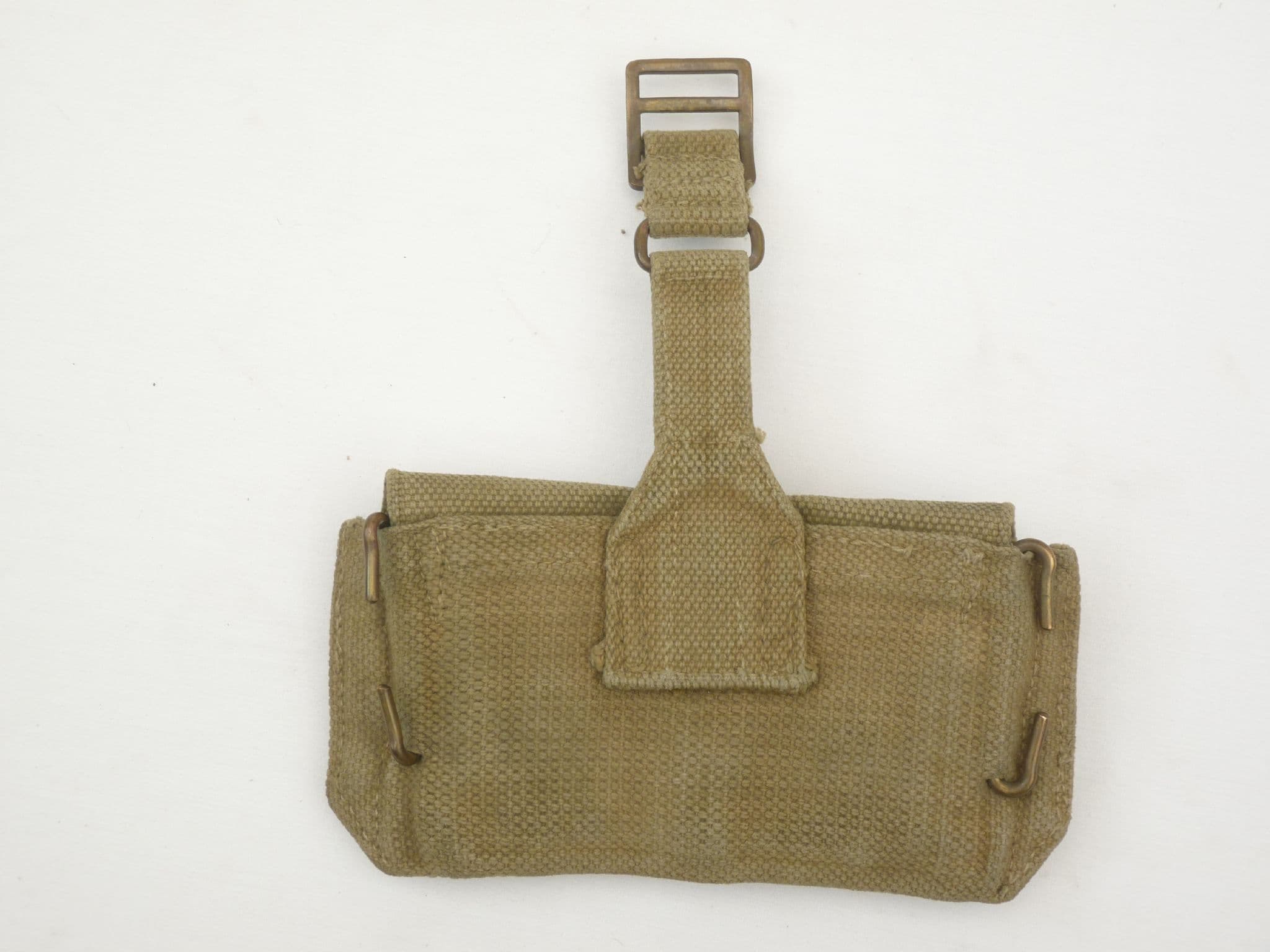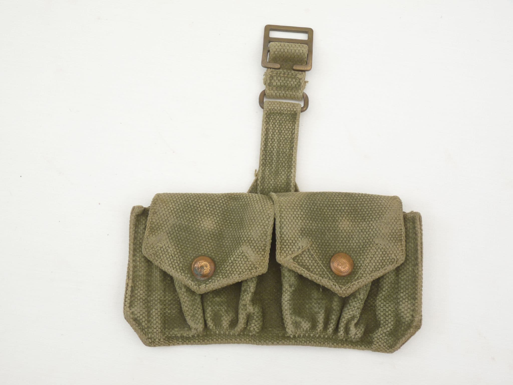 Pattern 1937 webbing ammunition pouches in very good condition with good poppers. Fits directly to webbing belt and shoulder strap, with no hanger for a holster. Each pouch has a divider and looks to hold 2x 5 round clips of .303 ammunition or similar, so total 20 rounds.  This pouch has been evenly coloured in  what looks like jungle green over the standard khaki on the front. Faintly marked MECo 1940 under the flap.